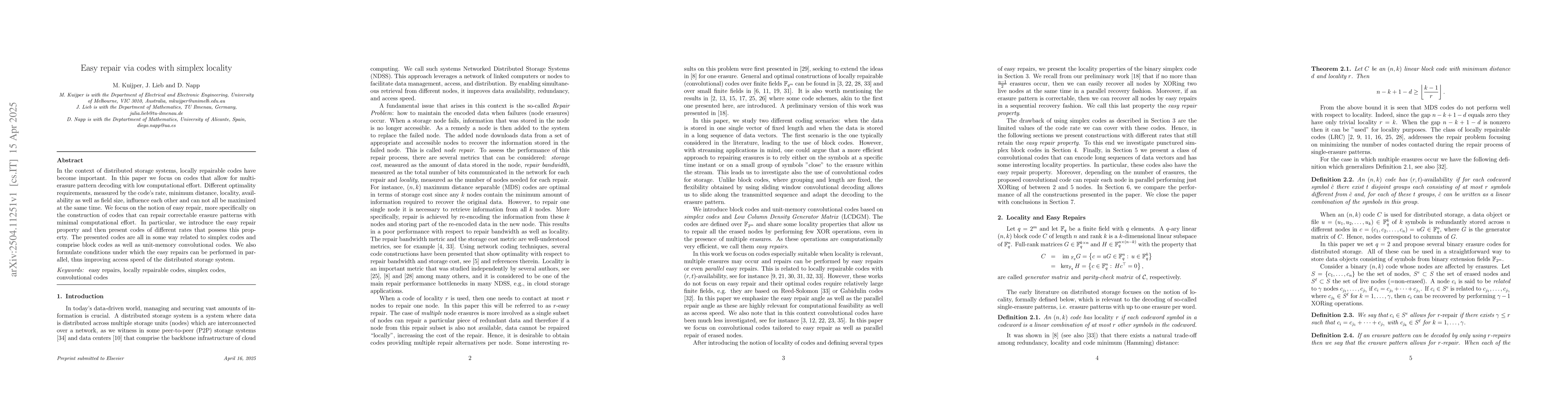 This work differs by specifically targeting 'easy repair' with codes linked to simplex structures, presenting both block and convolutional code variants, and formulating conditions for parallel repairs.