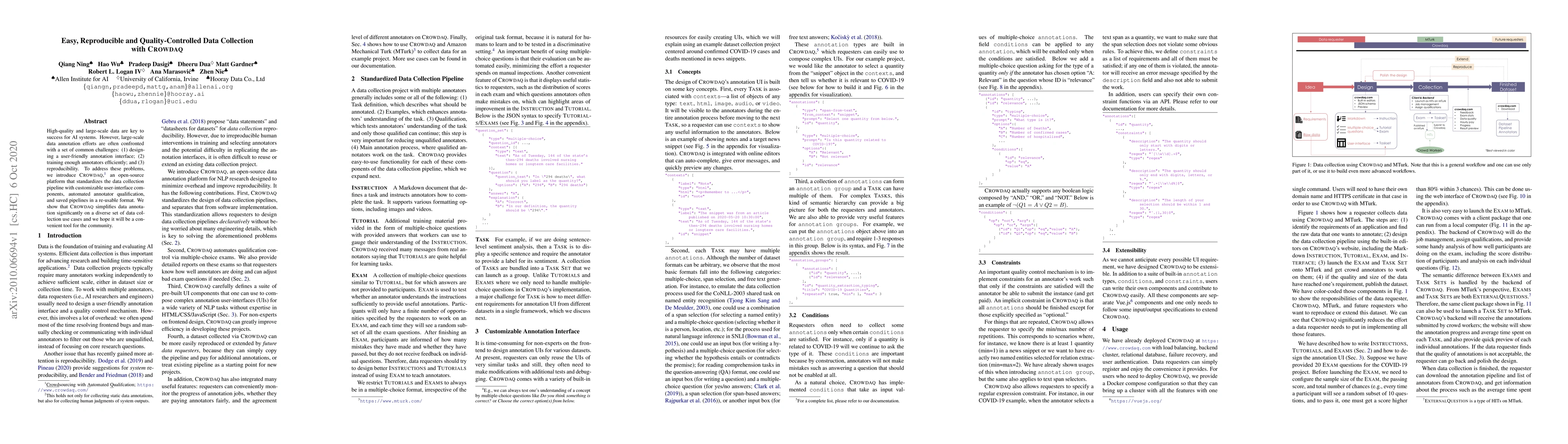 High-quality and large-scale data are key to success for AI systems. However, large-scale data annotation efforts are often confronted with a set of common challenges: (1) designing a user-friendly annotation interface; (2) training enough annotators efficiently; and (3) reproducibility. To address these problems, we introduce Crowdaq, an open-source platform that standardizes the data collection pipeline with customizable user-interface components, automated annotator qualification, and saved pipelines in a re-usable format. We show that Crowdaq simplifies data annotation significantly on a diverse set of data collection use cases and we hope it will be a convenient tool for the community.