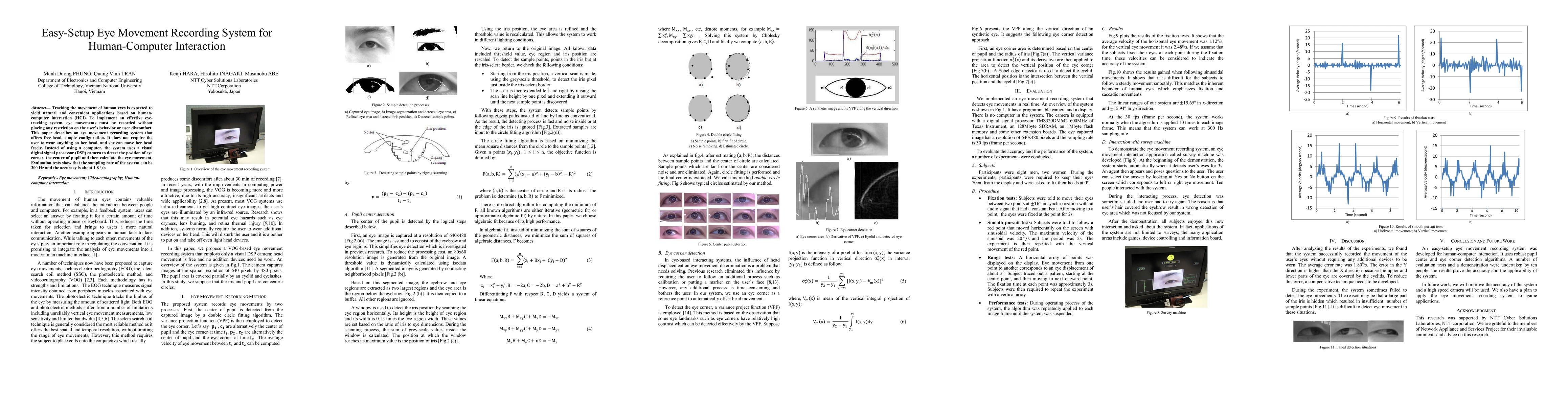 This paper presents a free-head, easy-setup eye movement recording system for human-computer interaction, utilizing a visual DSP camera to detect eye corners and pupil centers without user discomfort. Evaluations indicate a high sampling rate of 300 Hz and an accuracy of approximately 1.8 degrees/second.