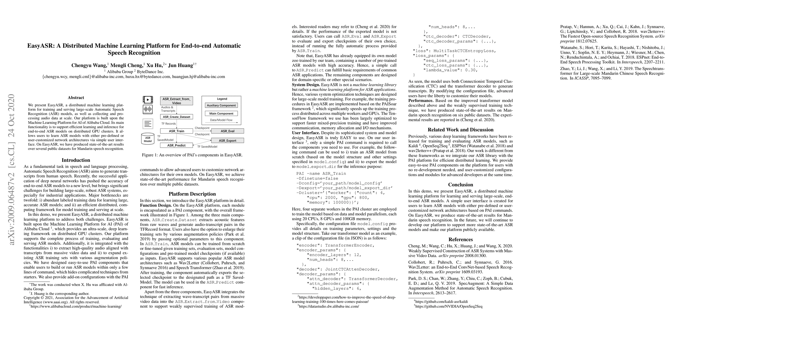 EasyASR is a distributed machine learning platform for training and serving large-scale Automatic Speech Recognition (ASR) models, leveraging Alibaba Cloud's AI infrastructure. It enables efficient end-to-end ASR model training and inference on GPU clusters, achieving state-of-the-art results on Mandarin speech recognition datasets.