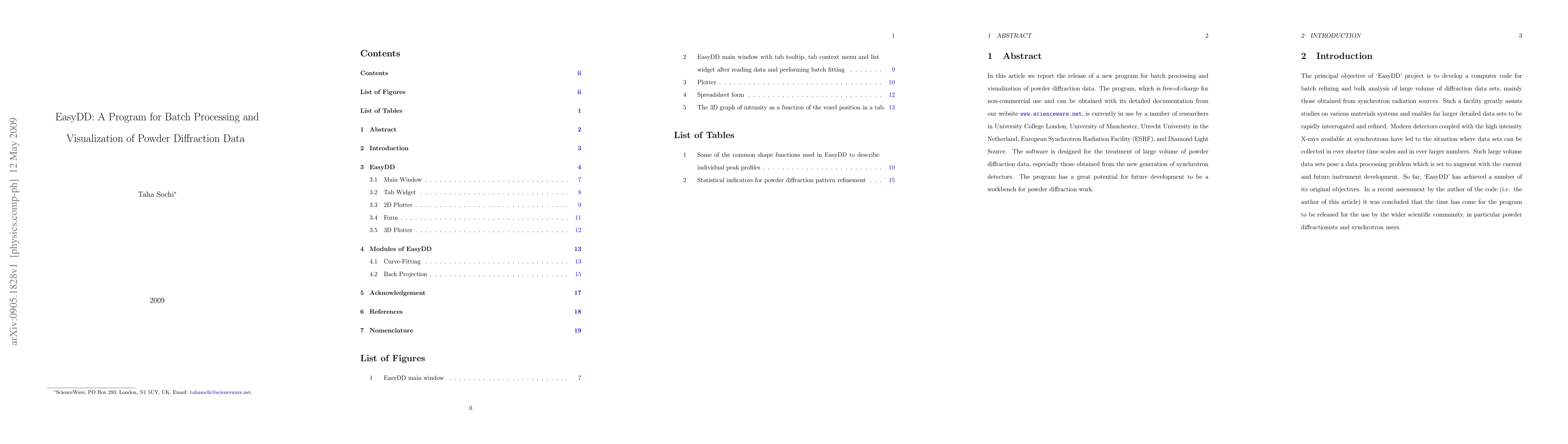 EasyDD is a free-of-charge program for batch processing and visualization of powder diffraction data, currently utilized by several research institutions. It is designed to handle large volumes of data from modern synchrotron detectors, with potential for future enhancements as a comprehensive workbench for powder diffraction analysis.