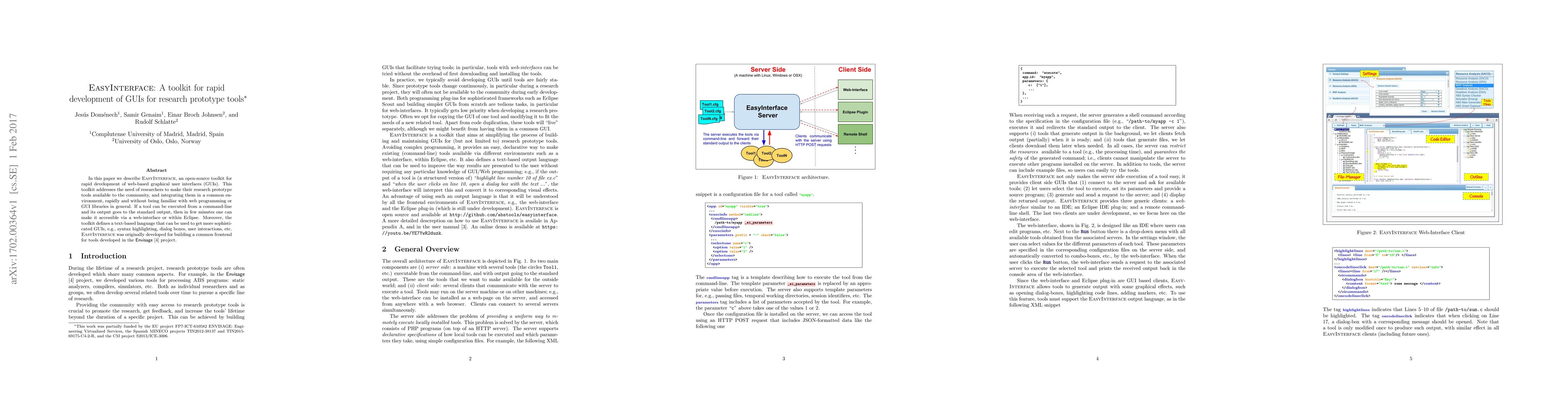 EasyInterface is an open-source toolkit for quickly developing web-based GUIs, enabling researchers to make their prototype tools accessible without web programming expertise. It supports sophisticated GUI features through a text-based language.