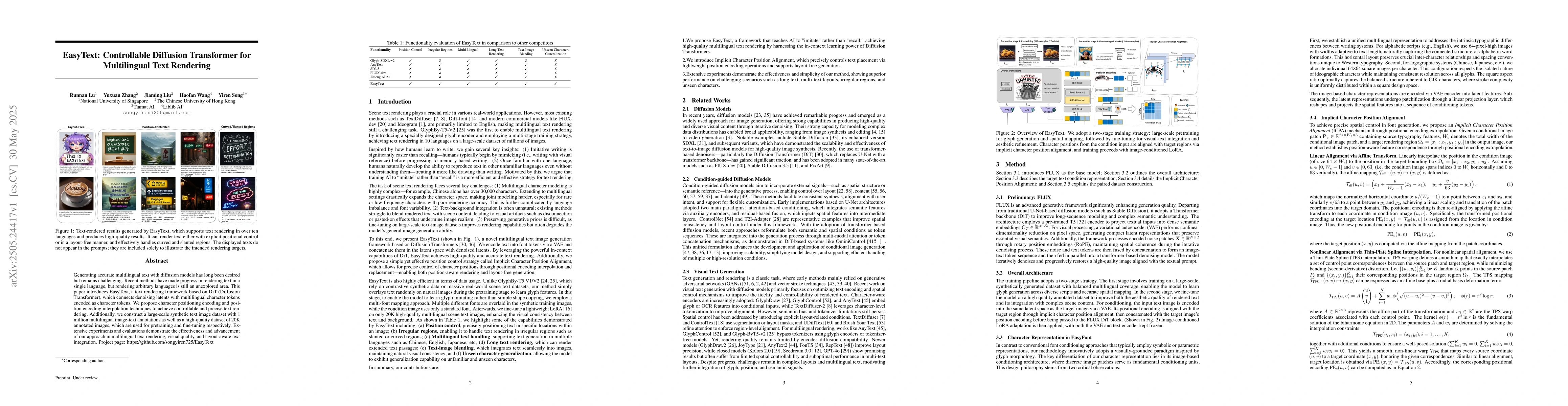 Introduces EasyText, a text rendering framework based on DiT (Diffusion Transformer) that connects denoising latents with multilingual character tokens. Utilizes character positioning encoding and position encoding interpolation for controllable text rendering. Constructs a large-scale synthetic text image dataset with 1 million multilingual image-text annotations and a high-quality dataset of 20K annotated images for pretraining and fine-tuning.