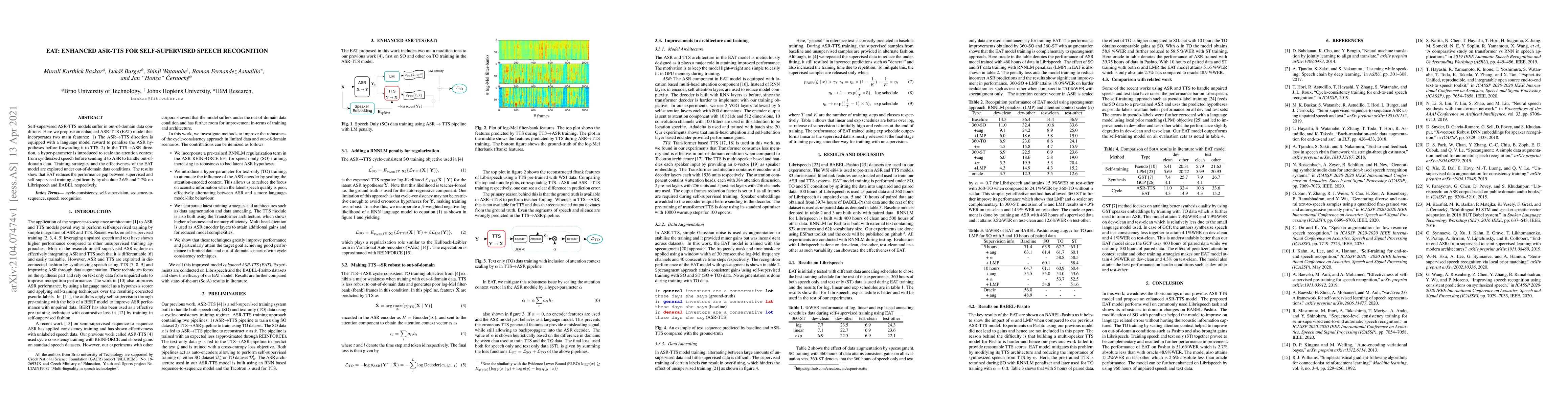 Self-supervised ASR-TTS models suffer in out-of-domain data conditions. Here we propose an enhanced ASR-TTS (EAT) model that incorporates two main features: 1) The ASR$\rightarrow$TTS direction is equipped with a language model reward to penalize the ASR hypotheses before forwarding it to TTS. 2) In the TTS$\rightarrow$ASR direction, a hyper-parameter is introduced to scale the attention context from synthesized speech before sending it to ASR to handle out-of-domain data. Training strategies and the effectiveness of the EAT model are explored under out-of-domain data conditions. The results show that EAT reduces the performance gap between supervised and self-supervised training significantly by absolute 2.6\% and 2.7\% on Librispeech and BABEL respectively.