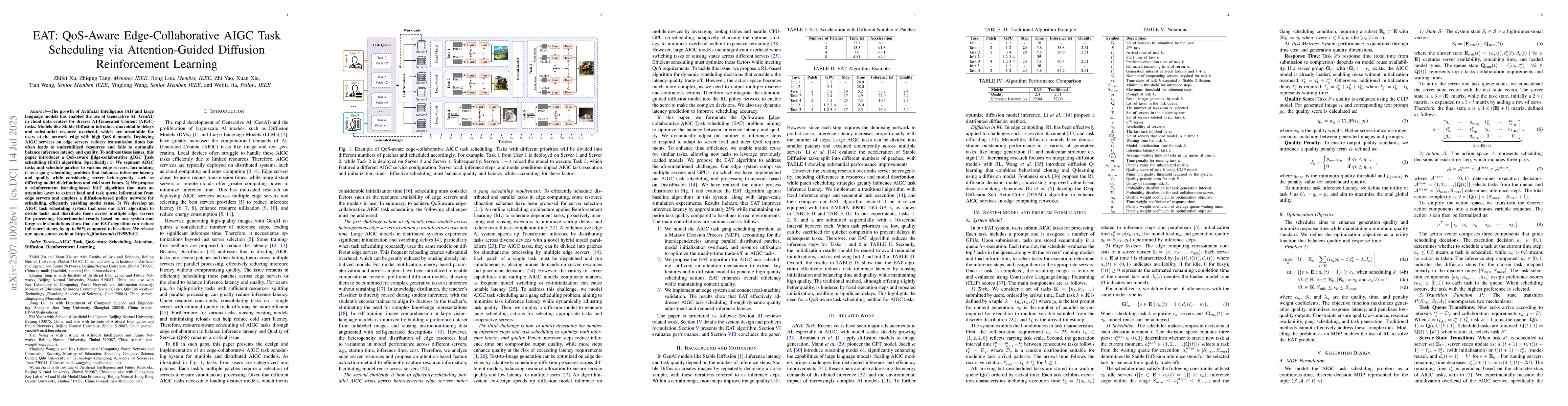 The growth of Artificial Intelligence (AI) and large language models has enabled the use of Generative AI (GenAI) in cloud data centers for diverse AI-Generated Content (AIGC) tasks. Models like Stable Diffusion introduce unavoidable delays and substantial resource overhead, which are unsuitable for users at the network edge with high QoS demands. Deploying AIGC services on edge servers reduces transmission times but often leads to underutilized resources and fails to optimally balance inference latency and quality. To address these issues, this paper introduces a QoS-aware \underline{E}dge-collaborative \underline{A}IGC \underline{T}ask scheduling (EAT) algorithm. Specifically: 1) We segment AIGC tasks and schedule patches to various edge servers, formulating it as a gang scheduling problem that balances inference latency and quality while considering server heterogeneity, such as differing model distributions and cold start issues. 2) We propose a reinforcement learning-based EAT algorithm that uses an attention layer to extract load and task queue information from edge servers and employs a diffusion-based policy network for scheduling, efficiently enabling model reuse. 3) We develop an AIGC task scheduling system that uses our EAT algorithm to divide tasks and distribute them across multiple edge servers for processing. Experimental results based on our system and large-scale simulations show that our EAT algorithm can reduce inference latency by up to 56\% compared to baselines. We release our open-source code at https://github.com/zzf1955/EAT.