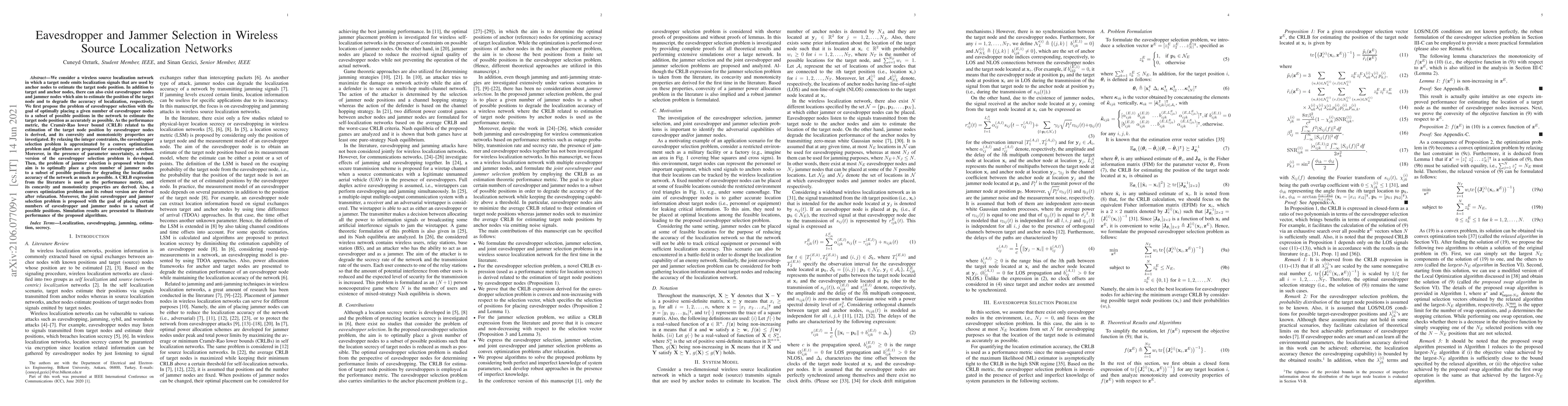 This paper investigates wireless source localization networks with eavesdropper and jammer nodes. It proposes methods for optimal placement of eavesdroppers to estimate target positions accurately and jammers to degrade localization accuracy, using the Cramer-Rao lower bound as a performance metric. Convex optimization and robust versions are developed for both selection problems, with simulation results demonstrating the effectiveness of the proposed algorithms.