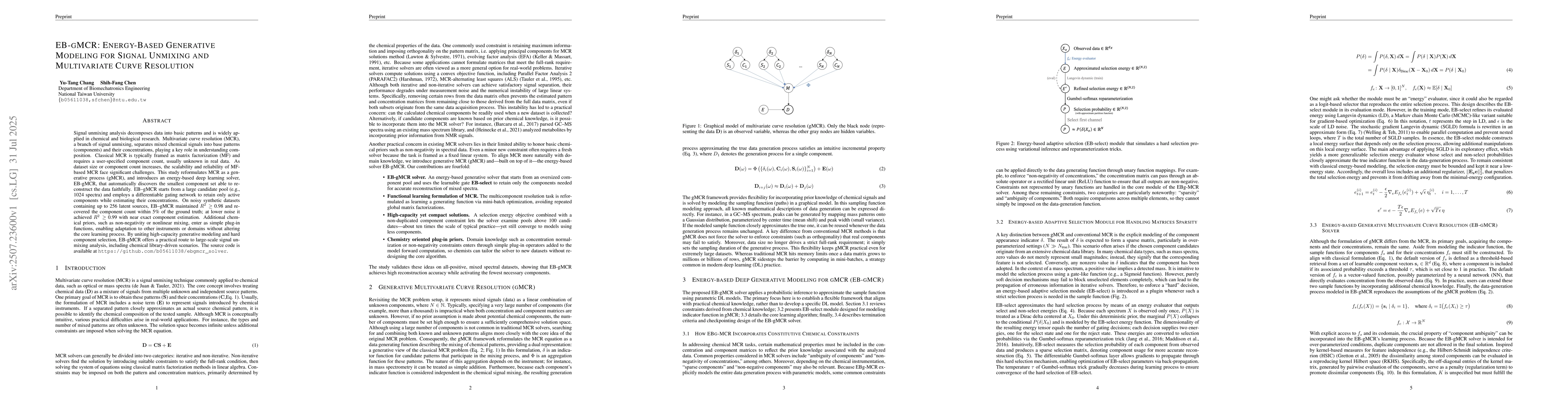 Signal unmixing analysis decomposes data into basic patterns and is widely applied in chemical and biological research. Multivariate curve resolution (MCR), a branch of signal unmixing, separates mixed chemical signals into base patterns (components) and their concentrations, playing a key role in understanding composition. Classical MCR is typically framed as matrix factorization (MF) and requires a user-specified component count, usually unknown in real data. As dataset size or component count increases, the scalability and reliability of MF-based MCR face significant challenges. This study reformulates MCR as a generative process (gMCR), and introduces an energy-based deep learning solver, EB-gMCR, that automatically discovers the smallest component set able to reconstruct the data faithfully. EB-gMCR starts from a large candidate pool (e.g., 1024 spectra) and employs a differentiable gating network to retain only active components while estimating their concentrations. On noisy synthetic datasets containing up to 256 latent sources, EB-gMCR maintained R^2 >= 0.98 and recovered the component count within 5% of the ground truth; at lower noise it achieved R^2 >= 0.99 with near exact component estimation. Additional chemical priors, such as non-negativity or nonlinear mixing, enter as simple plug-in functions, enabling adaptation to other instruments or domains without altering the core learning process. By uniting high-capacity generative modeling and hard component selection, EB-gMCR offers a practical route to large-scale signal unmixing analysis, including chemical library-driven scenarios. The source code is available at https://github.com/b05611038/ebgmcr_solver.