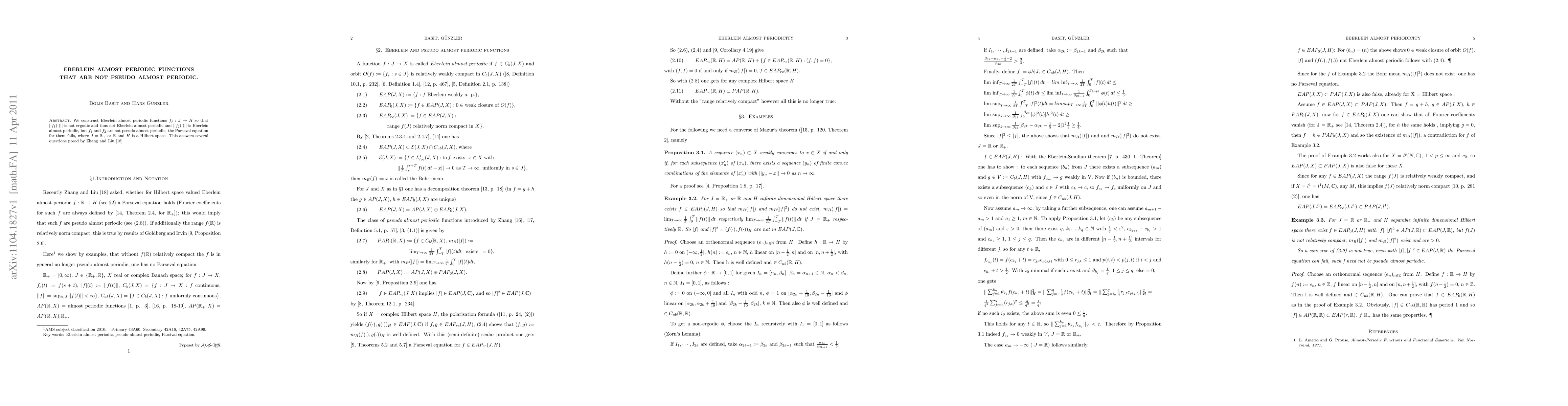 We construct Eberlein almost periodic functions $ f_j : J \to H$ so that $||f_1(\cdot)||$ is not ergodic and thus not Eberlein almost periodic and $||f_2(.)||$ is Eberlein almost periodic, but $f_1$ and $f_2$ are not pseudo almost periodic, the Parseval equation for them fails, where $J=\r_+$ or $\r$ and $H$ is a Hilbert space. This answers several questions posed by Zhang and Liu [18].