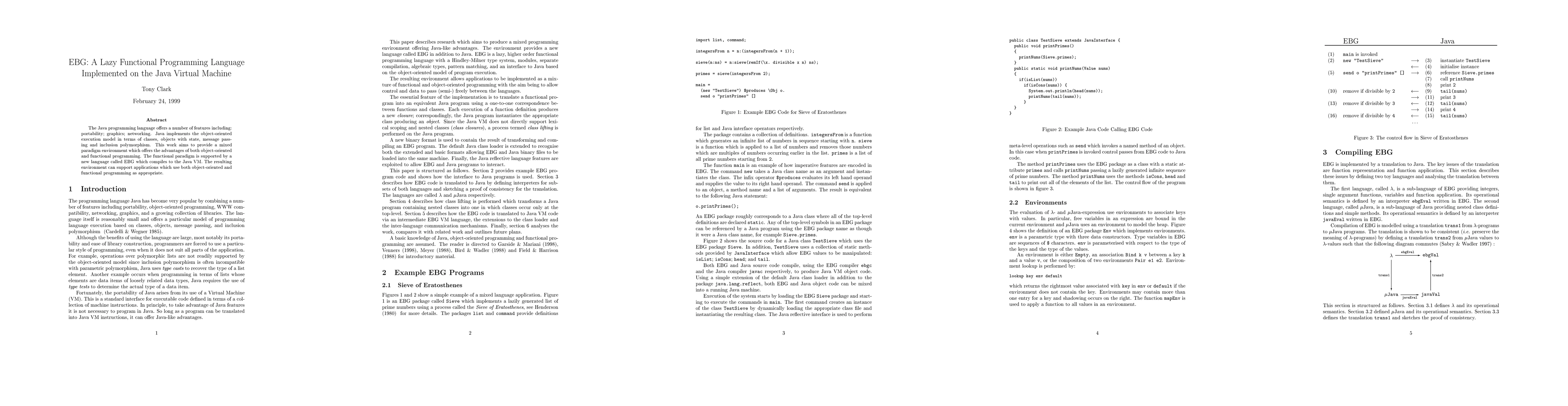 Summary: This report details the implementation of EBG, a lazy functional programming language, on the Java Virtual Machine, focusing on its unique features and performance characteristics. The language aims to leverage Java's robustness while maintaining the efficiency of lazy evaluation.