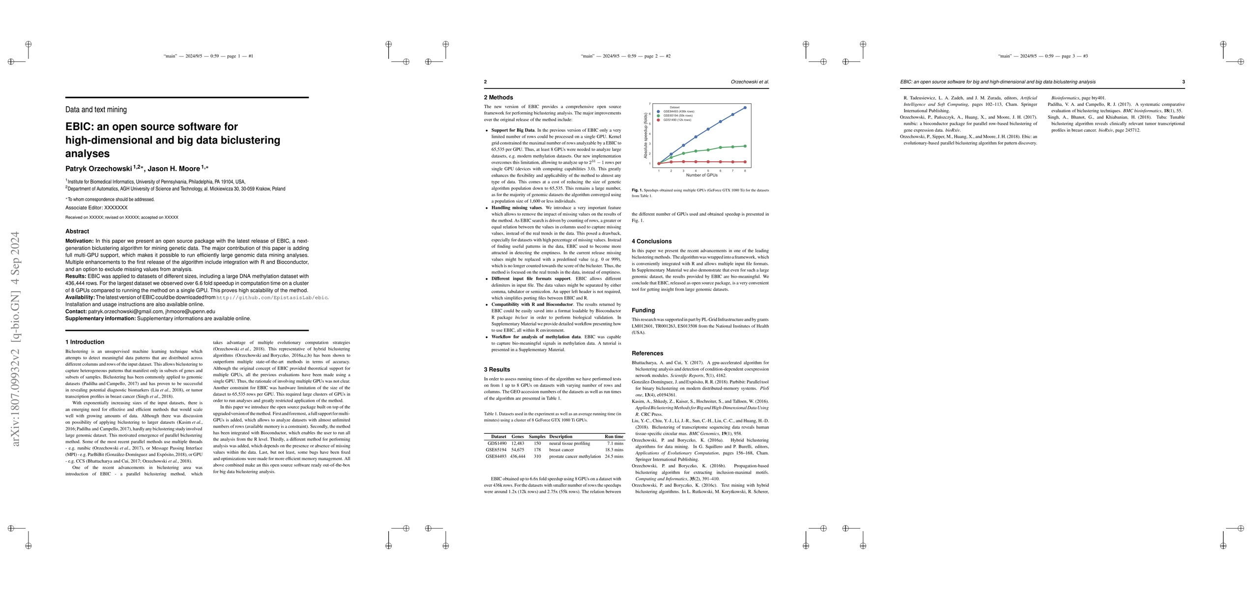 Motivation: In this paper we present the latest release of EBIC, a next-generation biclustering algorithm for mining genetic data. The major contribution of this paper is adding support for big data, making it possible to efficiently run large genomic data mining analyses. Additional enhancements include integration with R and Bioconductor and an option to remove influence of missing value on the final result. Results: EBIC was applied to datasets of different sizes, including a large DNA methylation dataset with 436,444 rows. For the largest dataset we observed over 6.6 fold speedup in computation time on a cluster of 8 GPUs compared to running the method on a single GPU. This proves high scalability of the algorithm. Availability: The latest version of EBIC could be downloaded from http://github.com/EpistasisLab/ebic . Installation and usage instructions are also available online.