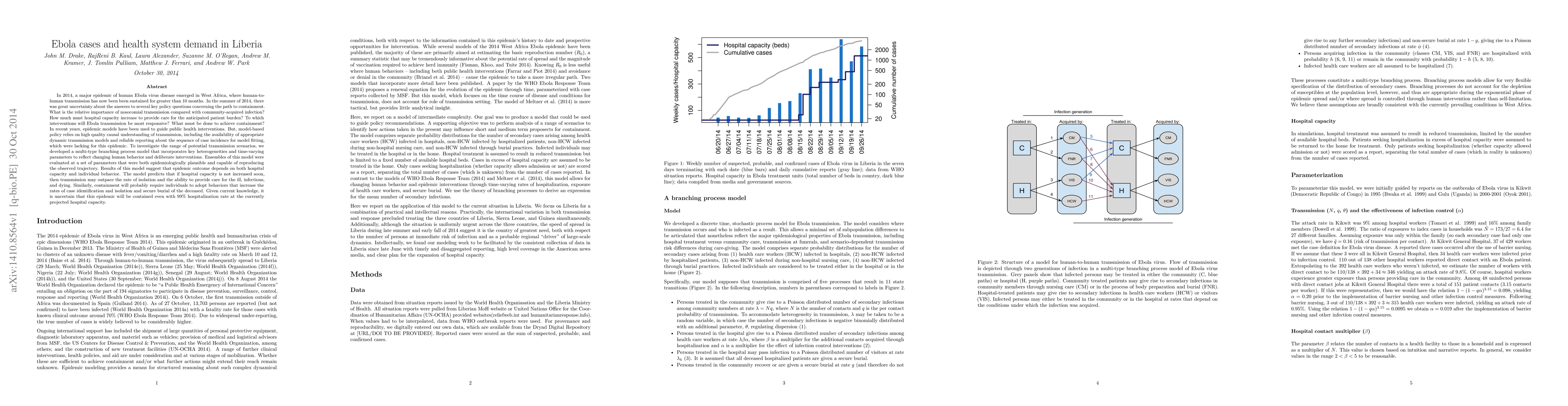 The research paper presents a multi-type branching process model to investigate Ebola transmission scenarios in Liberia during the 2014 epidemic. It suggests that both hospital capacity and individual behavior significantly impact epidemic containment, and with existing knowledge and hospital capacity, containing the epidemic remains uncertain.