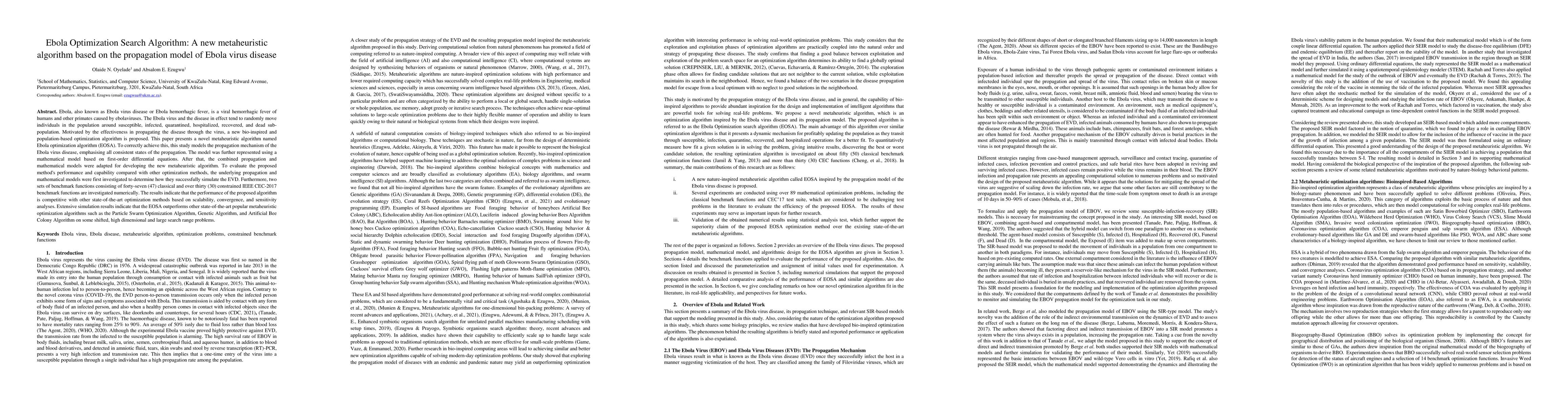 The Ebola Optimization Search Algorithm (EOSA) is a novel metaheuristic optimization method inspired by the propagation mechanism of Ebola virus disease. The algorithm was developed using a mathematical model based on first-order differential equations and was tested against various benchmark functions, demonstrating competitive performance compared to other optimization algorithms like PSO, GA, and ABC.
