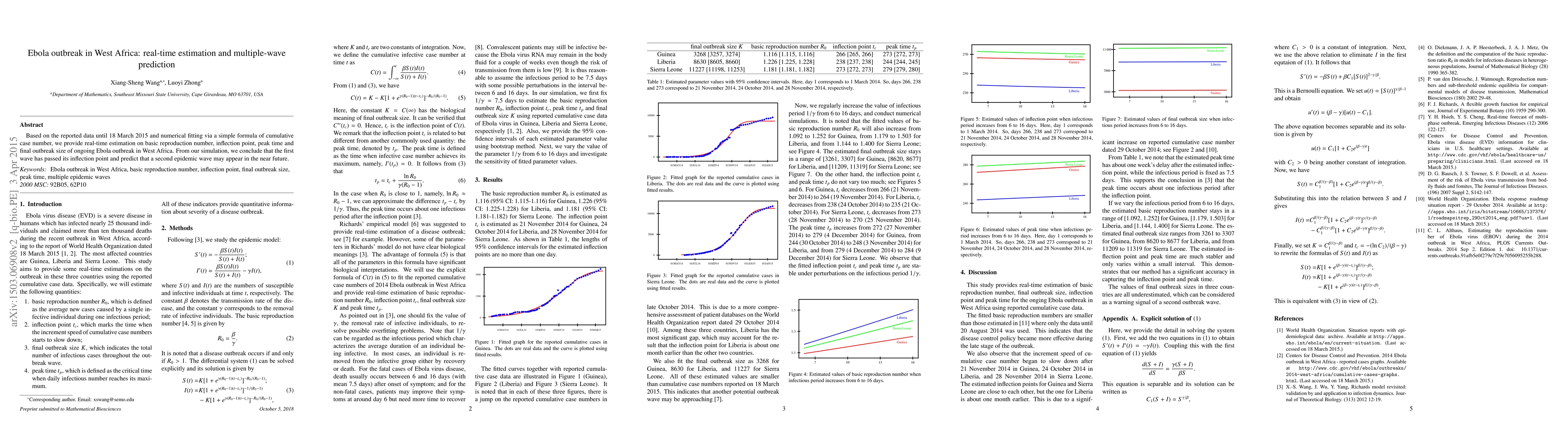 This research paper provides real-time estimates of the ongoing Ebola outbreak in West Africa using cumulative case data and numerical fitting, predicting the basic reproduction number, peak time, and final outbreak size. It concludes that the first wave has passed its inflection point and anticipates a potential second wave.