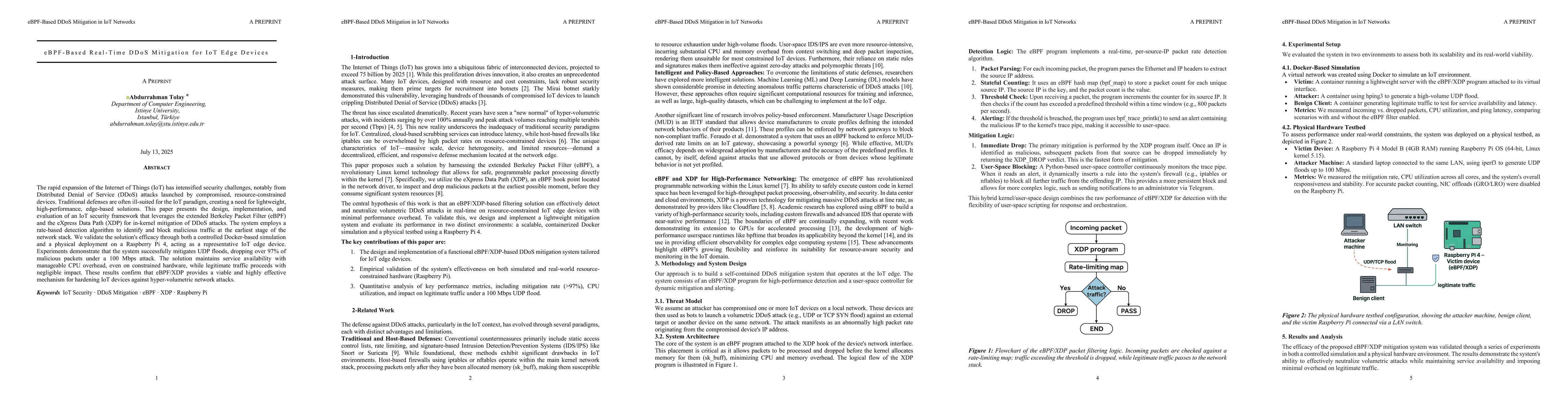 The rapid expansion of the Internet of Things (IoT) has intensified security challenges, notably from Distributed Denial of Service (DDoS) attacks launched by compromised, resource-constrained devices. Traditional defenses are often ill-suited for the IoT paradigm, creating a need for lightweight, high-performance, edge-based solutions. This paper presents the design, implementation, and evaluation of an IoT security framework that leverages the extended Berkeley Packet Filter (eBPF) and the eXpress Data Path (XDP) for in-kernel mitigation of DDoS attacks. The system uses a rate-based detection algorithm to identify and block malicious traffic at the earliest stage of the network stack. The framework is evaluated using both Docker-based simulations and real-world deployment on a Raspberry Pi 4, showing over 97% mitigation effectiveness under a 100 Mbps flood. Legitimate traffic remains unaffected, and system stability is preserved even under attack. These results confirm that eBPF/XDP provides a viable and highly efficient solution for hardening IoT edge devices against volumetric network attacks.