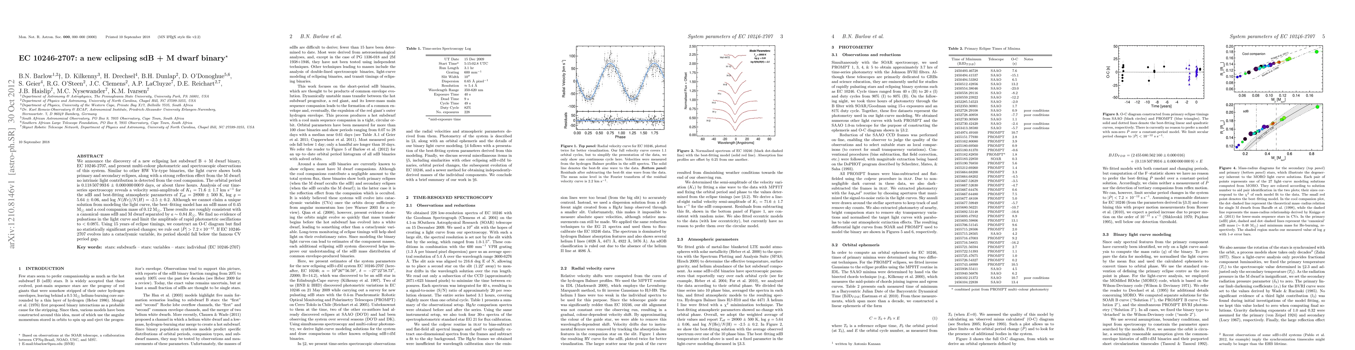 The paper announces the discovery of a new eclipsing hot subdwarf B (sdB) and M dwarf binary, EC 10246-2707. Multi-colour observations reveal the sdB has an effective temperature of ~28900 K, a velocity semi-amplitude of 71.6 km/s, and no detectable intrinsic light from the cool companion. The orbital period is approximately 3 hours, with masses estimated as 0.45 Msun for the sdB and 0.12 Msun for the M dwarf. No pulsations or significant period changes were found.