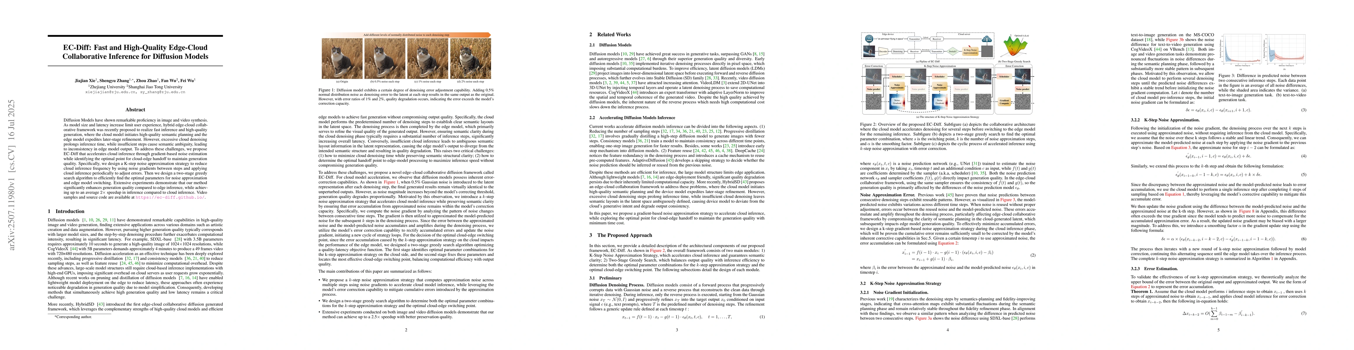 Diffusion Models have shown remarkable proficiency in image and video synthesis. As model size and latency increase limit user experience, hybrid edge-cloud collaborative framework was recently proposed to realize fast inference and high-quality generation, where the cloud model initiates high-quality semantic planning and the edge model expedites later-stage refinement. However, excessive cloud denoising prolongs inference time, while insufficient steps cause semantic ambiguity, leading to inconsistency in edge model output. To address these challenges, we propose EC-Diff that accelerates cloud inference through gradient-based noise estimation while identifying the optimal point for cloud-edge handoff to maintain generation quality. Specifically, we design a K-step noise approximation strategy to reduce cloud inference frequency by using noise gradients between steps and applying cloud inference periodically to adjust errors. Then we design a two-stage greedy search algorithm to efficiently find the optimal parameters for noise approximation and edge model switching. Extensive experiments demonstrate that our method significantly enhances generation quality compared to edge inference, while achieving up to an average $2\times$ speedup in inference compared to cloud inference. Video samples and source code are available at https://ec-diff.github.io/.