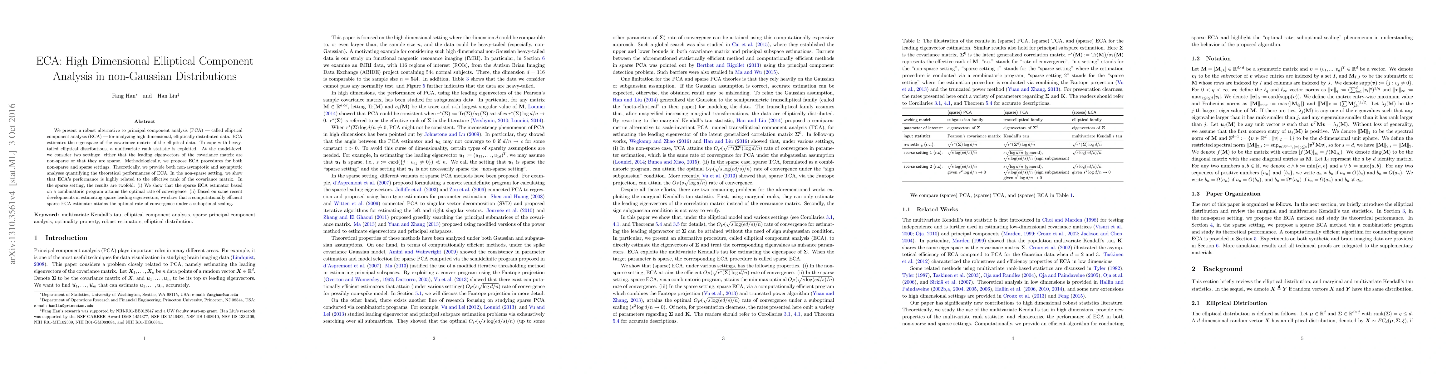 This paper introduces elliptical component analysis (ECA) as a robust alternative to PCA for high-dimensional elliptical data, employing a multivariate rank statistic for heavy-tailed distributions. It proposes ECA procedures for both non-sparse and sparse settings, with theoretical analyses showing optimal convergence rates under different conditions.