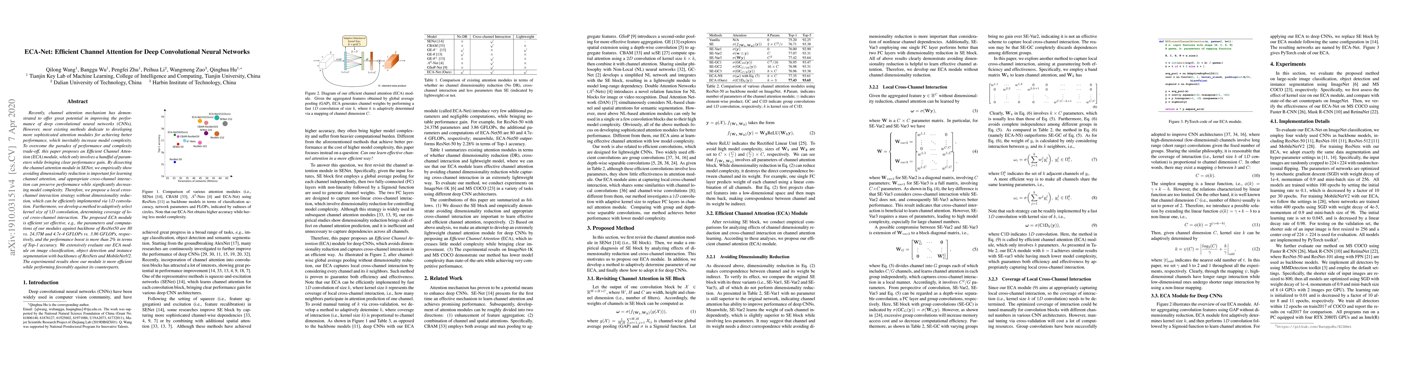 Recently, channel attention mechanism has demonstrated to offer great potential in improving the performance of deep convolutional neural networks (CNNs). However, most existing methods dedicate to developing more sophisticated attention modules for achieving better performance, which inevitably increase model complexity. To overcome the paradox of performance and complexity trade-off, this paper proposes an Efficient Channel Attention (ECA) module, which only involves a handful of parameters while bringing clear performance gain. By dissecting the channel attention module in SENet, we empirically show avoiding dimensionality reduction is important for learning channel attention, and appropriate cross-channel interaction can preserve performance while significantly decreasing model complexity. Therefore, we propose a local cross-channel interaction strategy without dimensionality reduction, which can be efficiently implemented via $1D$ convolution. Furthermore, we develop a method to adaptively select kernel size of $1D$ convolution, determining coverage of local cross-channel interaction. The proposed ECA module is efficient yet effective, e.g., the parameters and computations of our modules against backbone of ResNet50 are 80 vs. 24.37M and 4.7e-4 GFLOPs vs. 3.86 GFLOPs, respectively, and the performance boost is more than 2% in terms of Top-1 accuracy. We extensively evaluate our ECA module on image classification, object detection and instance segmentation with backbones of ResNets and MobileNetV2. The experimental results show our module is more efficient while performing favorably against its counterparts.