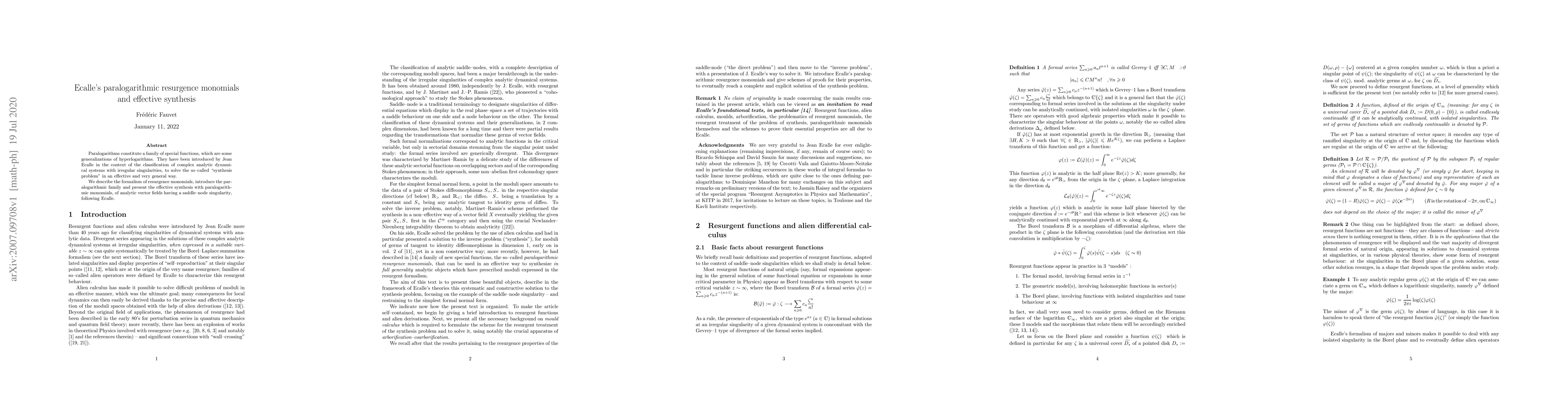 Paralogarithms constitute a family of special functions, which are some generalizations of hyperlogarithms. They have been introduced by Jean Ecalle in the context of the classification of complex analytic dynamical systems with irregular singularities, to solve the so-called "synthesis problem" in an effective and very general way. We describe the formalism of resurgence monomials, introduce the paralogarithmic family and present the effective synthesis with paralogarithmic monomials, of analytic vector fields having a saddle-node singularity, following Ecalle.