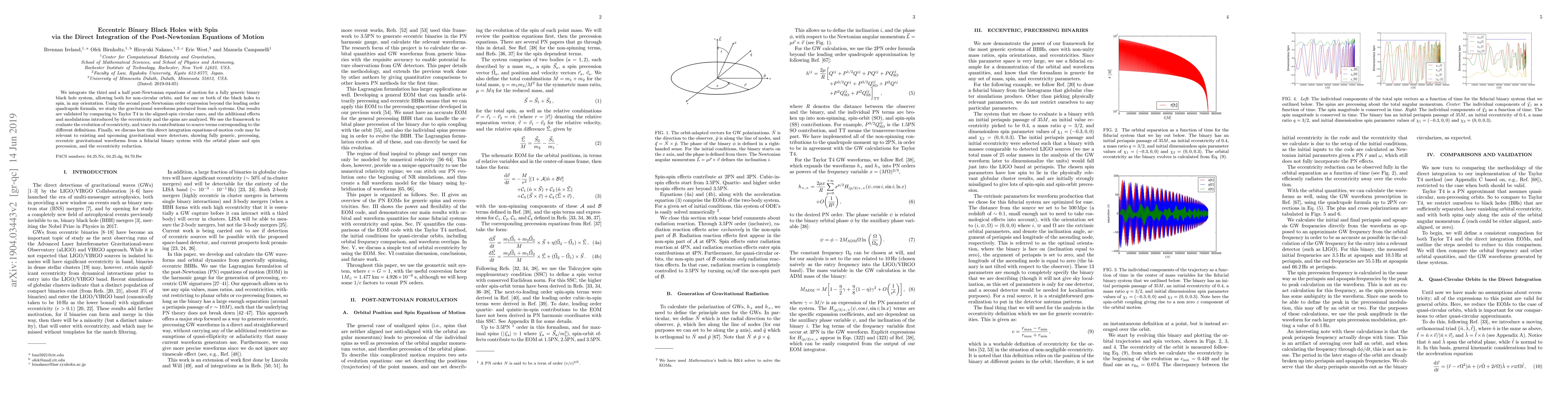 This paper integrates the third and a half post-Newtonian equations of motion for eccentric binary black holes with spinning components, analyzing the resulting gravitational waveforms. The study validates the results against Taylor T4 and explores the effects of eccentricity and spin orientation on waveform modulations.