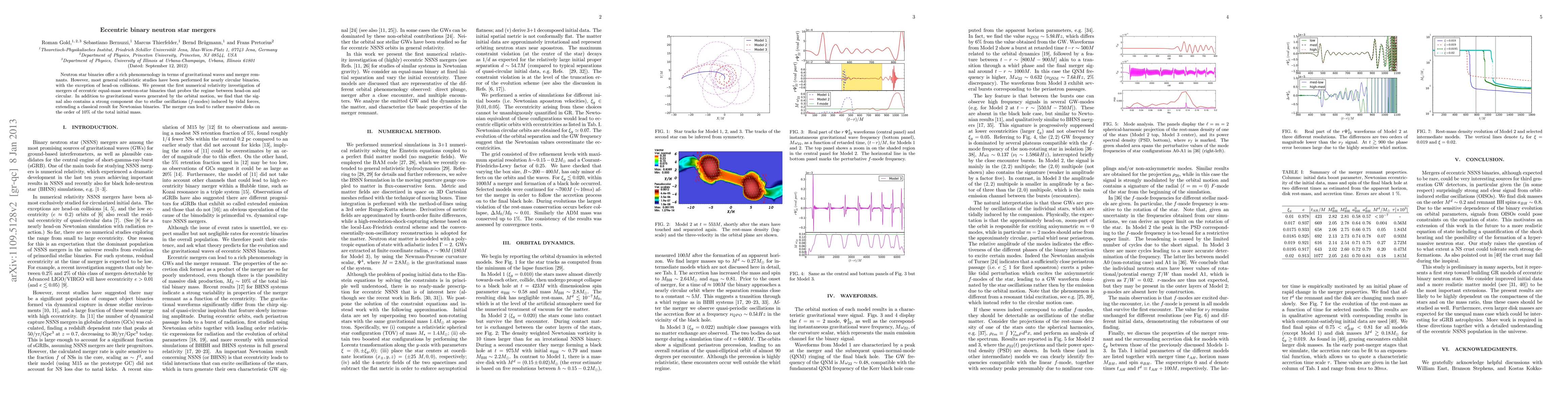This study investigates eccentric binary neutron star mergers using numerical relativity, revealing gravitational waves influenced by both orbital motion and tidally induced stellar oscillations. The findings suggest that such mergers can produce substantial disks, approximately 10% of the initial total mass.