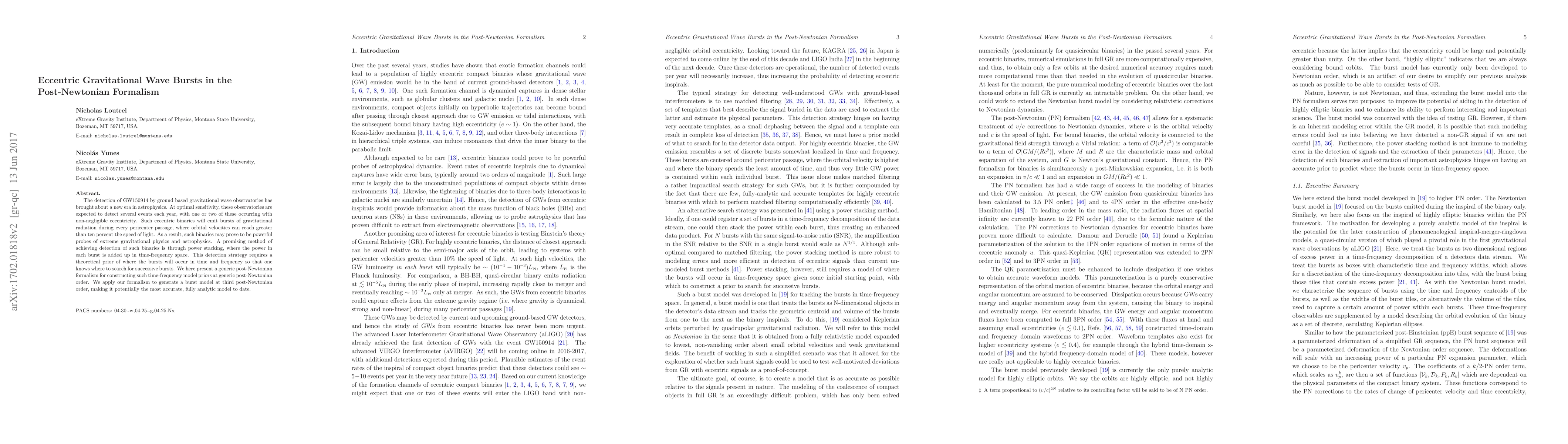 This paper develops a post-Newtonian formalism to predict gravitational wave bursts from eccentric binary systems, aiming to enhance detection strategies for these events. The authors generate a third post-Newtonian order burst model, which is the most accurate analytic model available to date, facilitating the detection of such systems through power stacking.