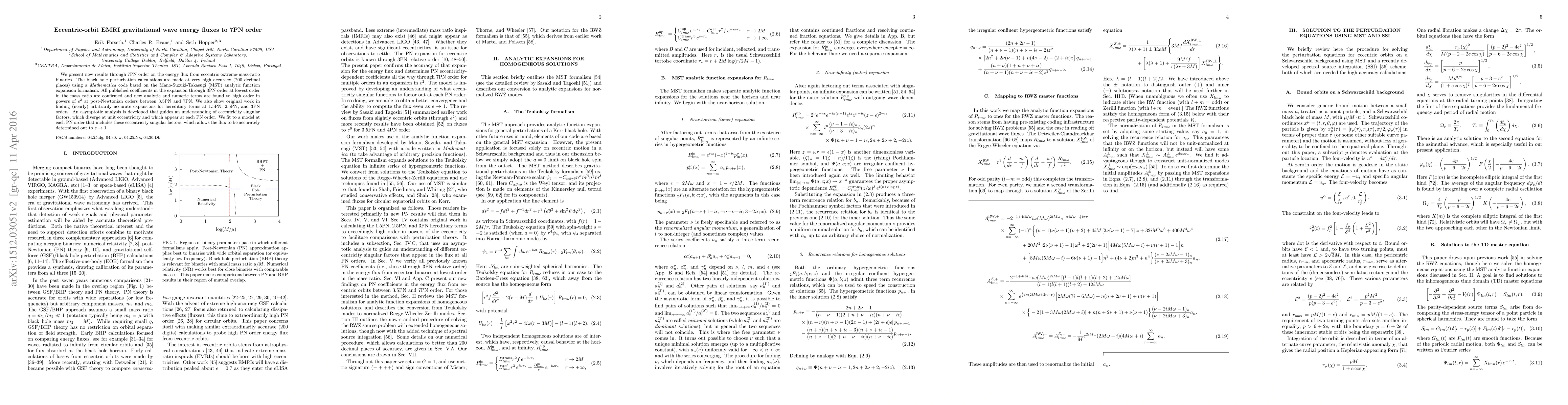 We present new results through 7PN order on the energy flux from eccentric extreme-mass-ratio binaries. The black hole perturbation calculations are made at very high accuracy (200 decimal places) using a Mathematica code based on the Mano-Suzuki-Takasugi (MST) analytic function expansion formalism. All published coefficients in the expansion through 3PN order are confirmed and new analytic and numeric terms are found to high order in $e^2$ at orders between 3.5PN and 7PN. We also show original work in finding (nearly) arbitrarily accurate expansions for hereditary terms at 1.5PN, 2.5PN, and 3PN orders. We fit to a model where at each PN order an eccentricity singular function is factored out, improving substantially the fit even as $e \to 1$.