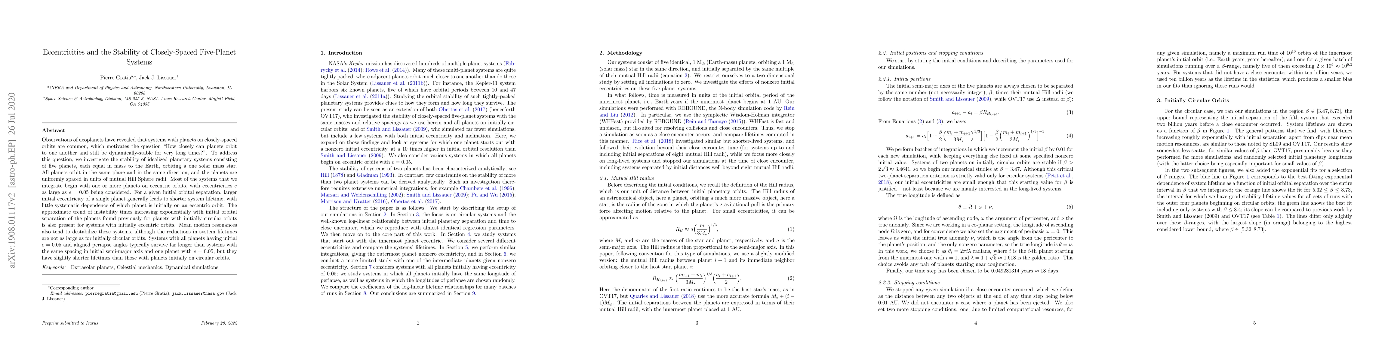 This paper examines the stability of five-planet systems with closely-spaced orbits, finding that larger initial eccentricities generally shorten system lifetimes. The study reveals that systems with initially eccentric orbits still exhibit an exponential increase in stability with greater orbital separation, though mean motion resonances destabilize them less severely than circular orbits.