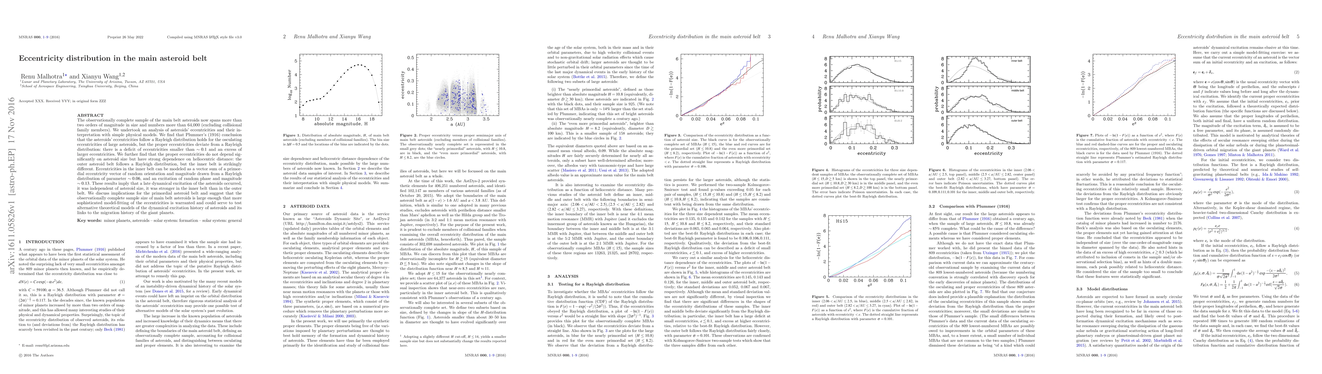 The observationally complete sample of the main belt asteroids now spans more than two orders of magnitude in size and numbers more than 64,000 (excluding collisional family members). We undertook an analysis of asteroids' eccentricities and their interpretation with simple physical models. We find that Plummer's (1916) conclusion that the asteroids' eccentricities follow a Rayleigh distribution holds for the osculating eccentricities of large asteroids, but the proper eccentricities deviate from a Rayleigh distribution: there is a deficit of eccentricities smaller than $\sim0.1$ and an excess of larger eccentricities. We further find that the proper eccentricities do not depend significantly on asteroid size but have strong dependence on heliocentric distance: the outer asteroid belt follows a Rayleigh distribution, but the inner belt is strikingly different. Eccentricities in the inner belt can be modeled as a vector sum of a primordial eccentricity vector of random orientation and magnitude drawn from a Rayleigh distribution of parameter $\sim0.06$, and an excitation of random phase and magnitude $\sim0.13$. These results imply that a late dynamical excitation of the asteroids occurred, it was independent of asteroid size, it was stronger in the inner belt than in the outer belt. We discuss implications for the primordial asteroid belt and suggest that the observationally complete sample size of main belt asteroids is large enough that more sophisticated model-fitting of the eccentricities is warranted and could serve to test alternative theoretical models of the dynamical excitation history of asteroids and its links to the migration history of the giant planets.