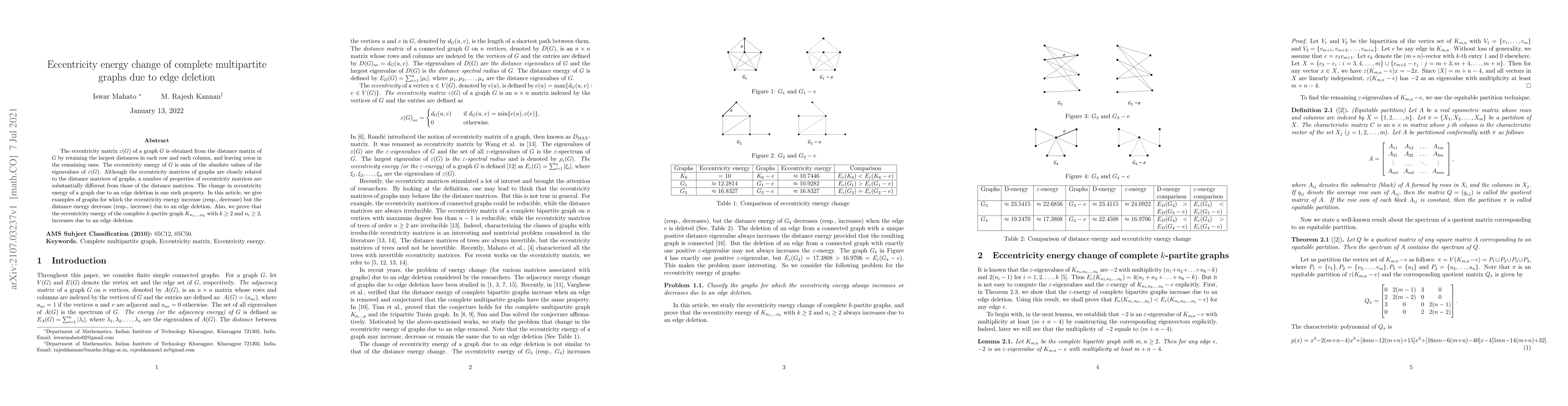 This paper investigates how the eccentricity energy of complete multipartite graphs changes with edge deletion. It demonstrates that eccentricity energy can increase while distance energy decreases upon edge removal, and proves that eccentricity energy of complete $k$-partite graphs with $k\geq 2$ and $n_i\geq 2$ rises with edge deletion.