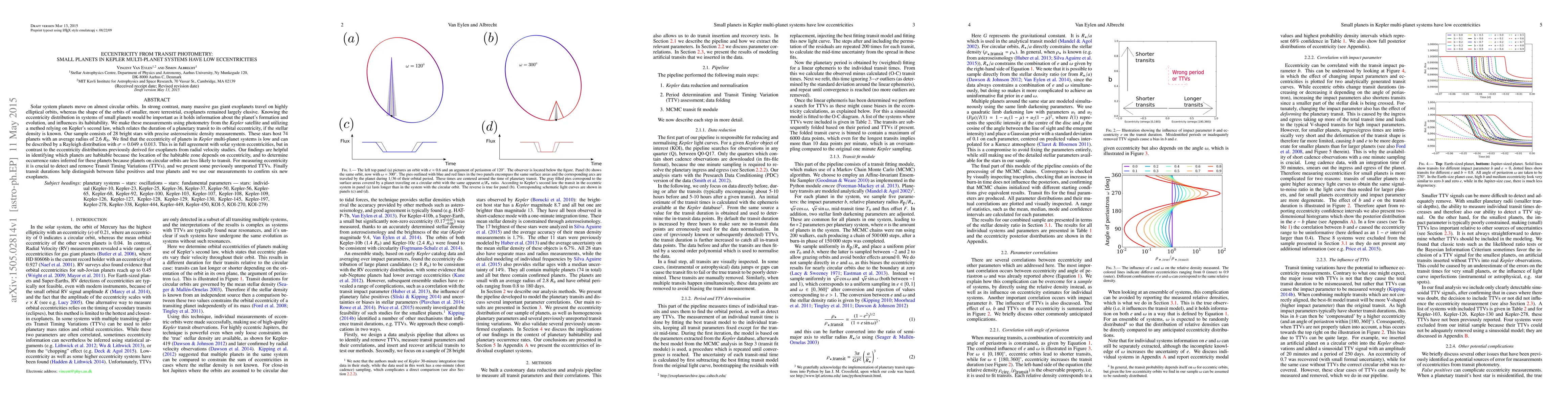 This study uses Kepler satellite photometry to measure eccentricities of small planets in multi-planet systems, finding low eccentricities described by a Rayleigh distribution with $\sigma$ = 0.049 $\pm$ 0.013, similar to solar system planets. This contrasts with previous radial velocity studies and suggests these planets are more likely to be habitable and transit.