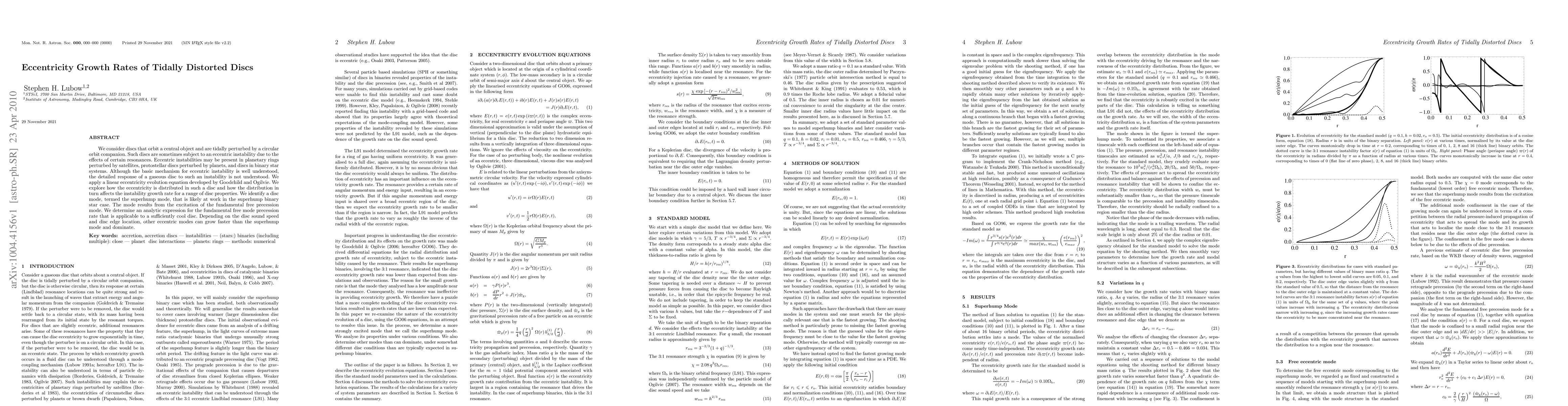 This paper investigates the eccentricity growth in tidally distorted discs due to eccentric instabilities, applying a linear evolution equation to explore the distribution of eccentricity and its impact on instability growth rates. It identifies a superhump mode driven by the fundamental free precession mode, with varying growth rates depending on disc properties like sound speed and edge location.