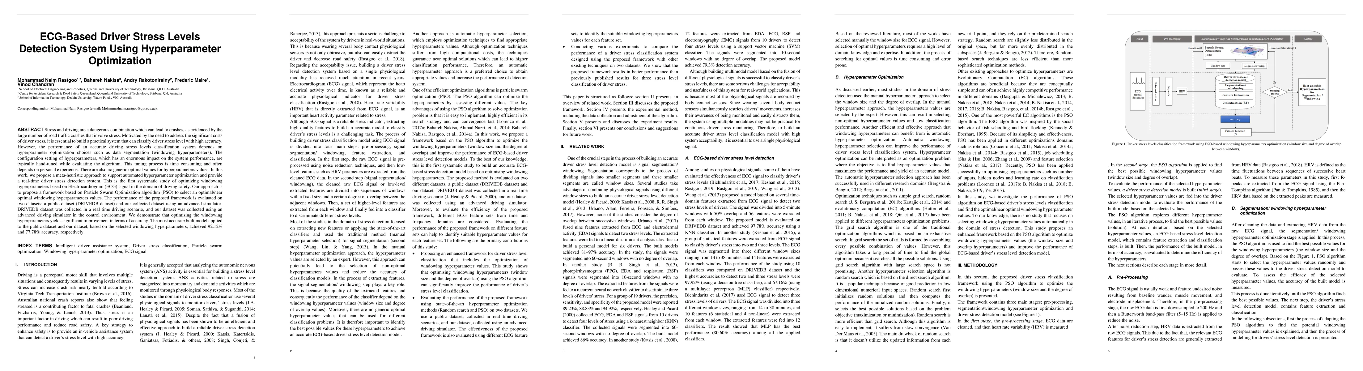 Stress and driving are a dangerous combination which can lead to crashes, as evidenced by the large number of road traffic crashes that involve stress. Motivated by the need to address the significant costs of driver stress, it is essential to build a practical system that can classify driver stress level with high accuracy. However, the performance of an accurate driving stress levels classification system depends on hyperparameter optimization choices such as data segmentation (windowing hyperparameters). The configuration setting of hyperparameters, which has an enormous impact on the system performance, are typically hand-tuned while evaluating the algorithm. This tuning process is time consuming and often depends on personal experience. There are also no generic optimal values for hyperparameters values. In this work, we propose a meta-heuristic approach to support automated hyperparameter optimization and provide a real-time driver stress detection system. This is the first systematic study of optimizing windowing hyperparameters based on Electrocardiogram (ECG) signal in the domain of driving safety. Our approach is to propose a framework based on Particle Swarm Optimization algorithm (PSO) to select an optimal/near optimal windowing hyperparameters values. The performance of the proposed framework is evaluated on two datasets: a public dataset (DRIVEDB dataset) and our collected dataset using an advanced simulator. DRIVEDB dataset was collected in a real time driving scenario, and our dataset was collected using an advanced driving simulator in the control environment. We demonstrate that optimising the windowing hyperparameters yields significant improvement in terms of accuracy. The most accurate built model applied to the public dataset and our dataset, based on the selected windowing hyperparameters, achieved 92.12% and 77.78% accuracy, respectively.