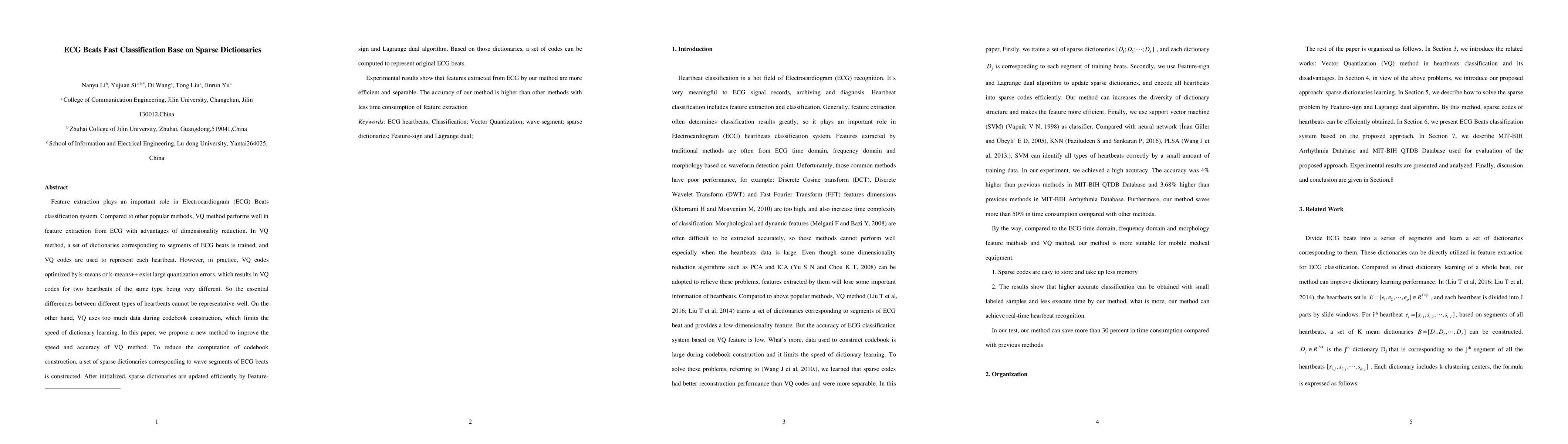 This paper proposes a new method to improve the speed and accuracy of Vector Quantization (VQ) for ECG beat classification by using sparse dictionaries. The sparse dictionaries reduce computation during codebook construction and are updated efficiently using the Feature-sign and Lagrange dual algorithm, resulting in more efficient and separable features compared to traditional VQ methods.