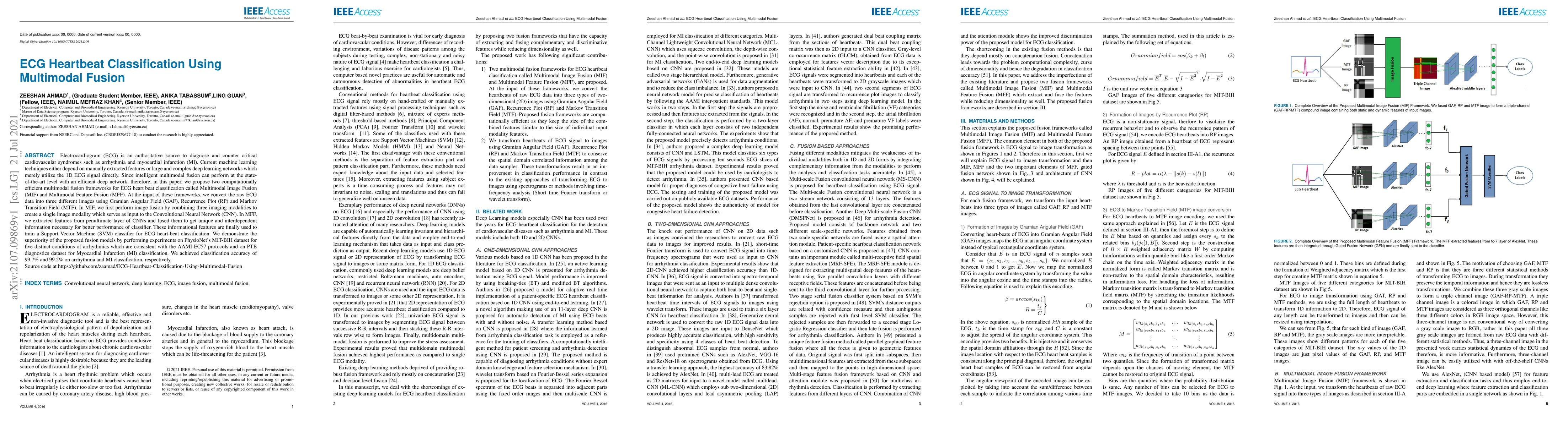 This paper proposes two multimodal fusion frameworks—Multimodal Image Fusion (MIF) and Multimodal Feature Fusion (MFF)—for ECG heartbeat classification. The MIF framework converts raw ECG data into images and fuses them before feeding into a CNN, while MFF extracts and fuses features from CNNs before training an SVM classifier. The proposed methods achieve high classification accuracies of 99.7% for arrhythmias and 99.2% for myocardial infarction.