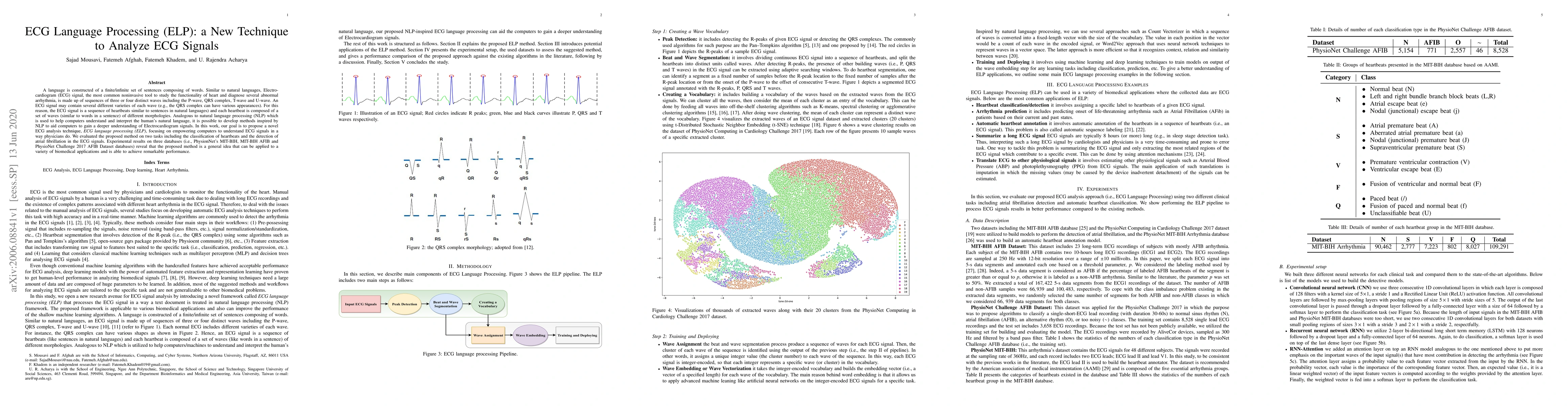 The paper proposes a novel technique called ECG language processing (ELP) to analyze ECG signals by drawing parallels to natural language processing (NLP). The method aims to enable computers to understand ECG signals similarly to physicians, achieving notable performance in classifying heartbeats and detecting atrial fibrillation across three databases.