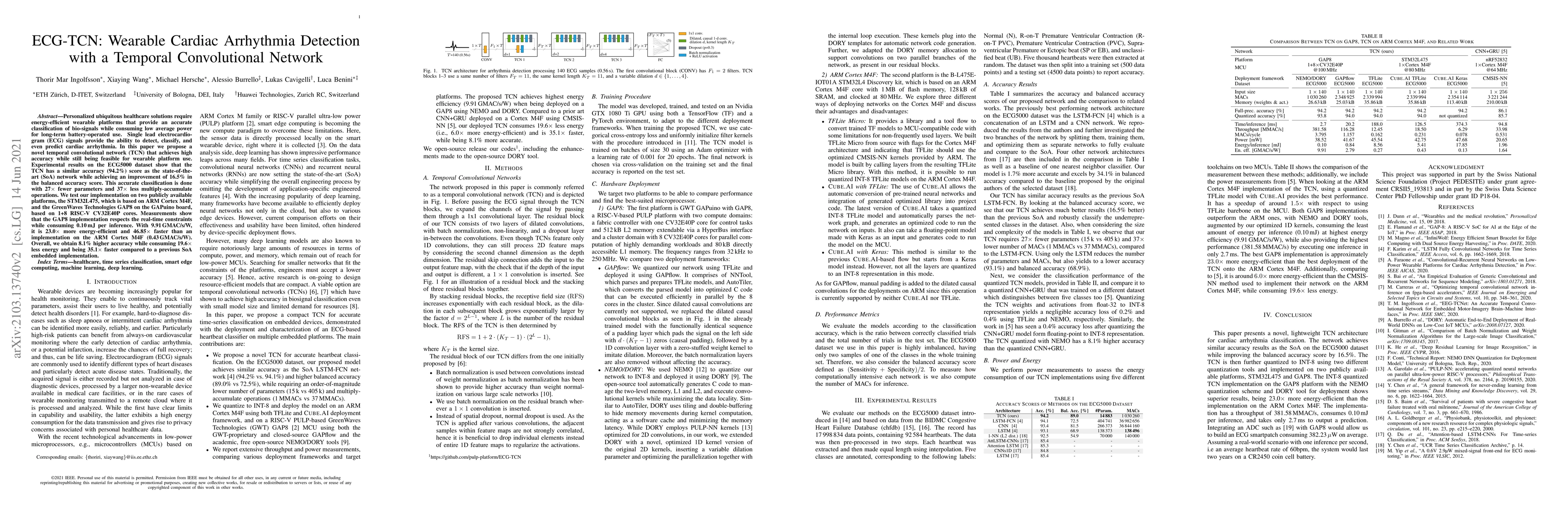 This paper proposes a temporal convolutional network (TCN) for accurate, energy-efficient detection of cardiac arrhythmia using single-lead ECG signals. The TCN achieves 94.2% accuracy with significantly fewer parameters and operations, demonstrating superior performance on embedded platforms, especially the GAP8, which is 23 times more energy-efficient and 35 times faster than previous solutions.