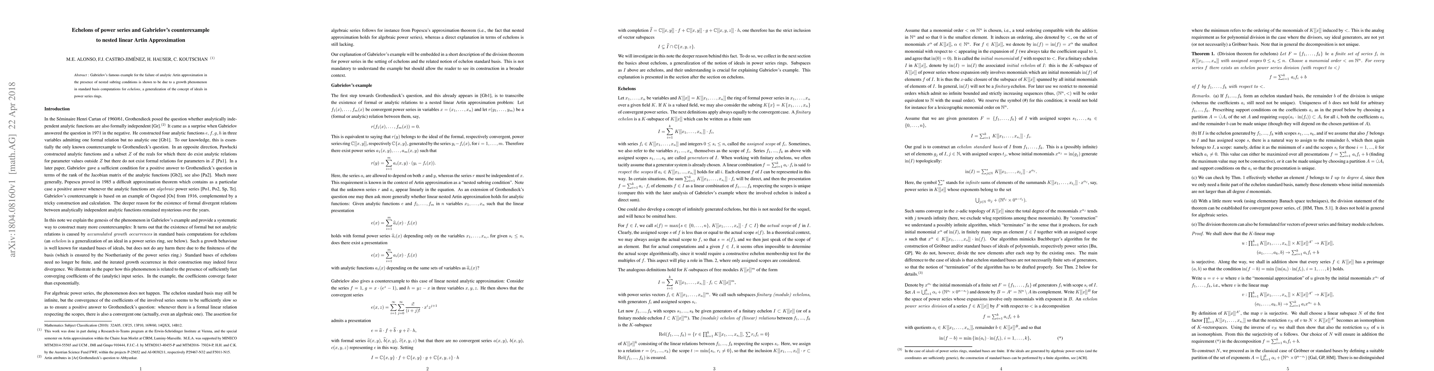 Gabrielov's counterexample demonstrates the failure of analytic Artin approximation under nested subring conditions, attributed to a growth issue in standard basis computations for echelons in power series rings. This highlights the complexity of approximations in such algebraic structures.