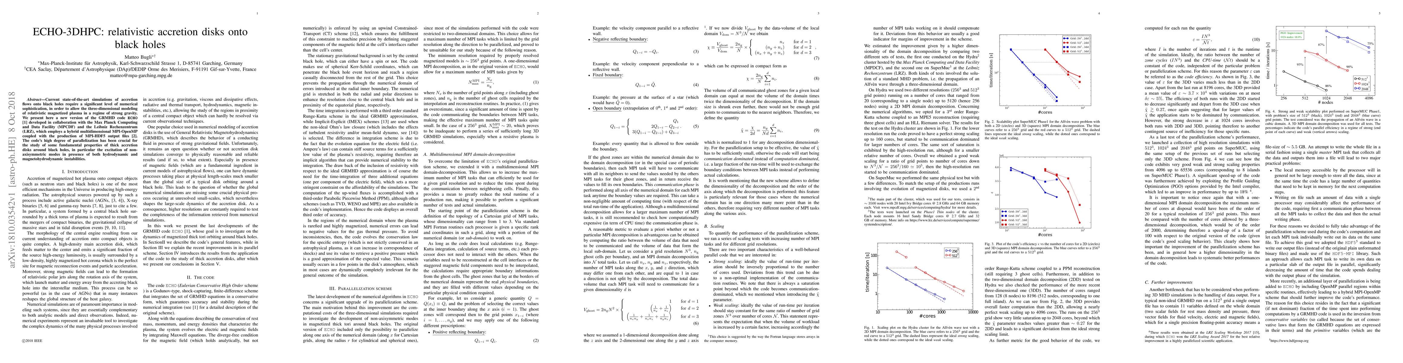 Current state-of-the-art simulations of accretion flows onto black holes require a significant level of numerical sophistication, in order to allow the three-dimensional modelling of relativistic magnetised plasma in a regime of strong gravity. We present here a new version of the GRMHD code \texttt{ECHO} developed in collaboration with the Max Planck Computing and Data Facility (MPCDF) and the Leibniz Rechenzentrum (LRZ), which employs a hybrid multidimensional MPI-OpenMP coupled with the production of MPI-HDF5 output files. The code's high degree of parallelisation has been crucial for the study of some fundamental properties of thick accretion disks around black holes, in particular the excitation of non-axisymmetric modes in presence of both hydrodynamic and magnetohydrodynamic instabilities.