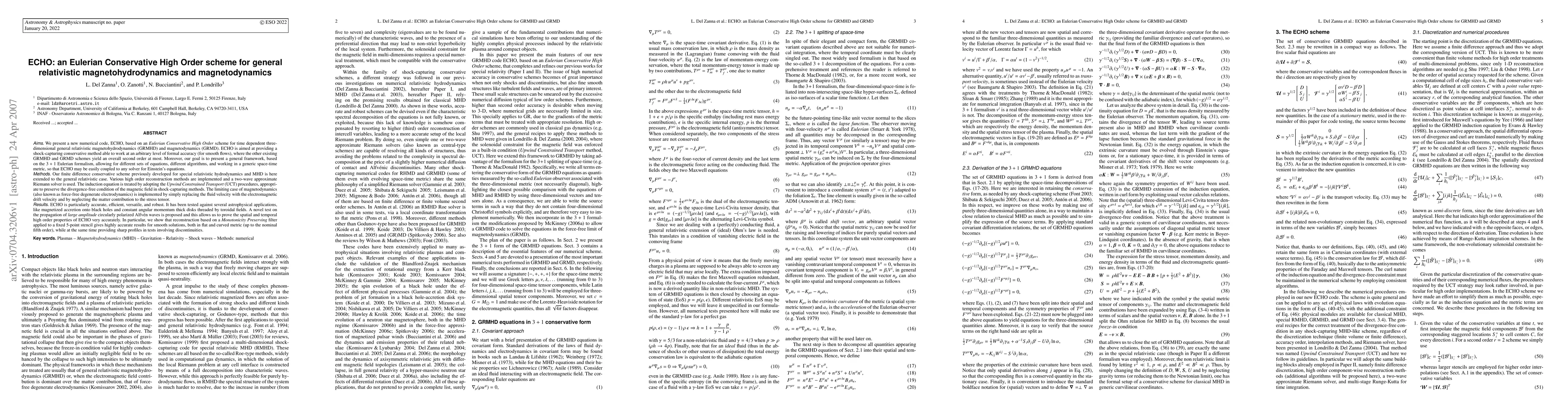 ECHO is a novel numerical code for general relativistic magnetohydrodynamics (GRMHD) and magnetodynamics (GRMD), offering high accuracy, efficiency, and robustness. It uses an Eulerian Conservative High Order scheme, two-wave approximate Riemann solver, and Upwind Constrained Transport (UCT) procedures, ensuring divergence-free magnetic fields. ECHO has been tested with astrophysical applications, demonstrating accuracy for smooth solutions and sharp profiles in discontinuity tests, in both flat and curved metrics.