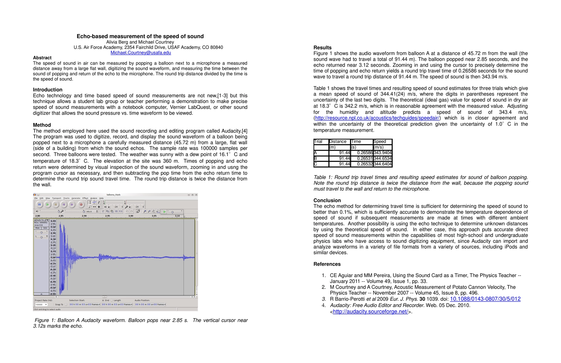 This paper describes a method to measure the speed of sound in air using a balloon pop, a microphone, and an echo. The time difference between the balloon pop and the echo's return is used to calculate the speed of sound.