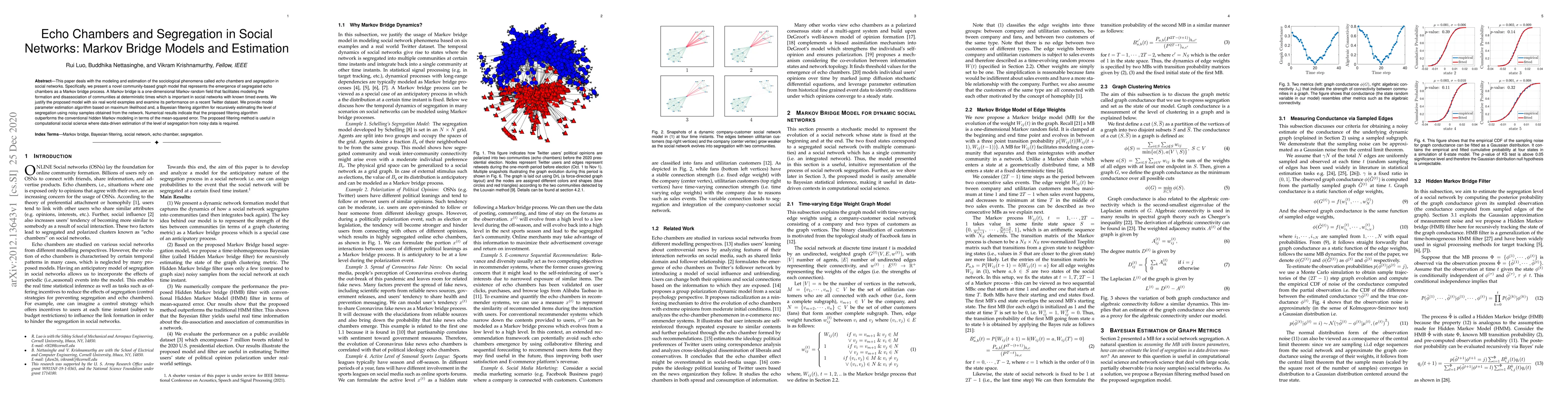 This paper deals with the modeling and estimation of the sociological phenomena called echo chambers and segregation in social networks. Specifically, we present a novel community-based graph model that represents the emergence of segregated echo chambers as a Markov bridge process. A Markov bridge is a one-dimensional Markov random field that facilitates modeling the formation and disassociation of communities at deterministic times which is important in social networks with known timed events. We justify the proposed model with six real world examples and examine its performance on a recent Twitter dataset. We provide model parameter estimation algorithm based on maximum likelihood and, a Bayesian filtering algorithm for recursively estimating the level of segregation using noisy samples obtained from the network. Numerical results indicate that the proposed filtering algorithm outperforms the conventional hidden Markov modeling in terms of the mean-squared error. The proposed filtering method is useful in computational social science where data-driven estimation of the level of segregation from noisy data is required.