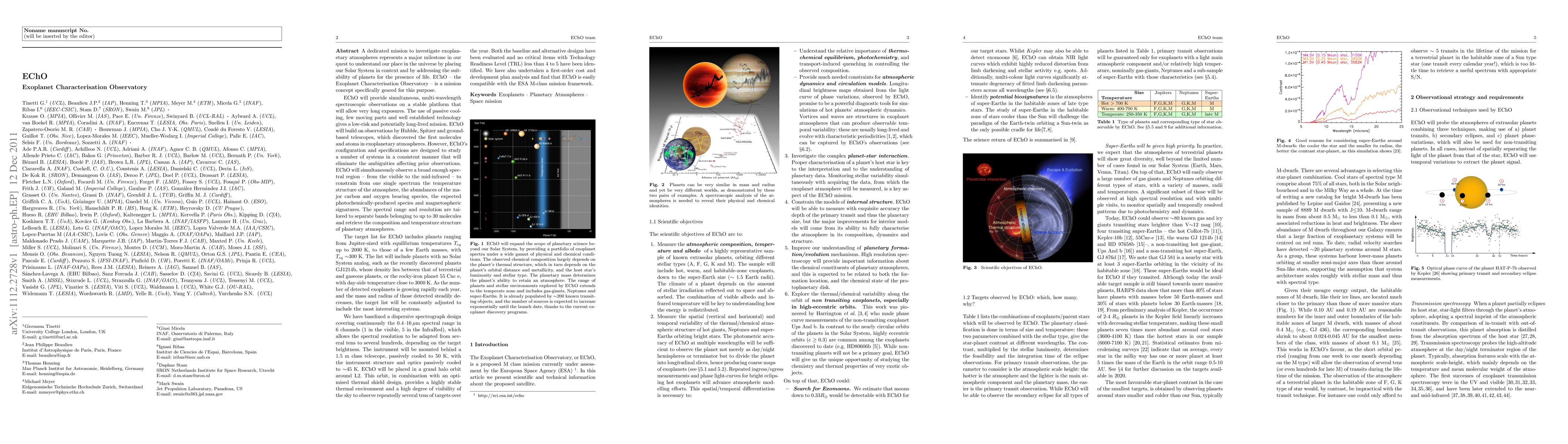 EChO, the Exoplanet Characterisation Observatory, aims to investigate exoplanetary atmospheres through multi-wavelength spectroscopic observations, providing detailed insights into the temperature structure and molecular composition of diverse exoplanets, from gas giants to Earth-sized planets. The mission is designed to fit within the ESA M-class mission framework.
