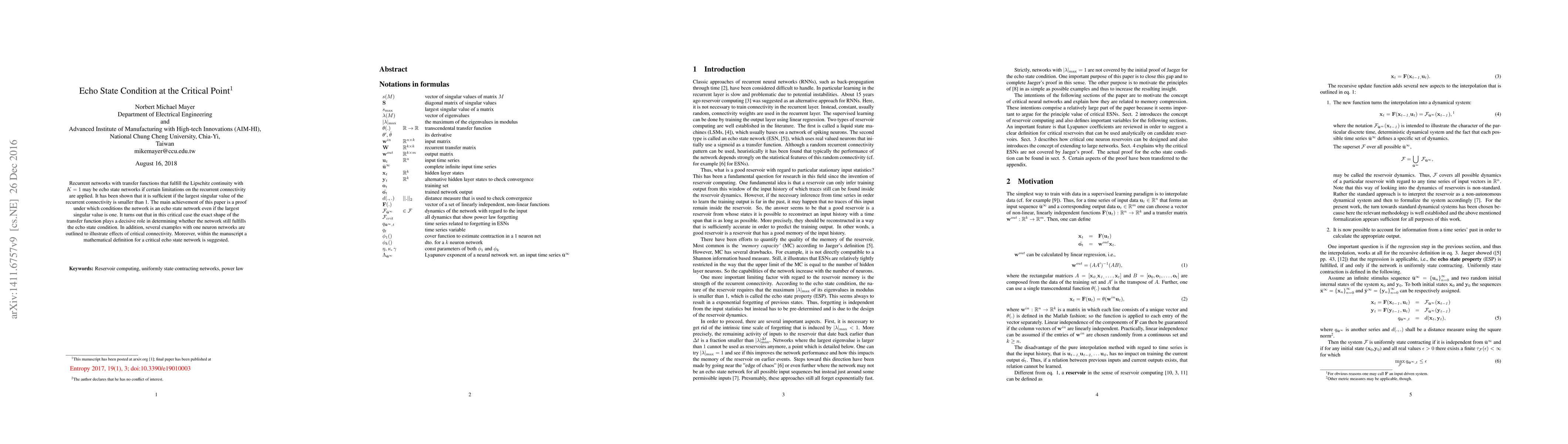 Recurrent networks with transfer functions that fulfill the Lipschitz continuity with K=1 may be echo state networks if certain limitations on the recurrent connectivity are applied. It has been shown that it is sufficient if the largest singular value of the recurrent connectivity is smaller than 1. The main achievement of this paper is a proof under which conditions the network is an echo state network even if the largest singular value is one. It turns out that in this critical case the exact shape of the transfer function plays a decisive role in determining whether the network still fulfills the echo state condition. In addition, several examples with one neuron networks are outlined to illustrate effects of critical connectivity. Moreover, within the manuscript a mathematical definition for a critical echo state network is suggested.