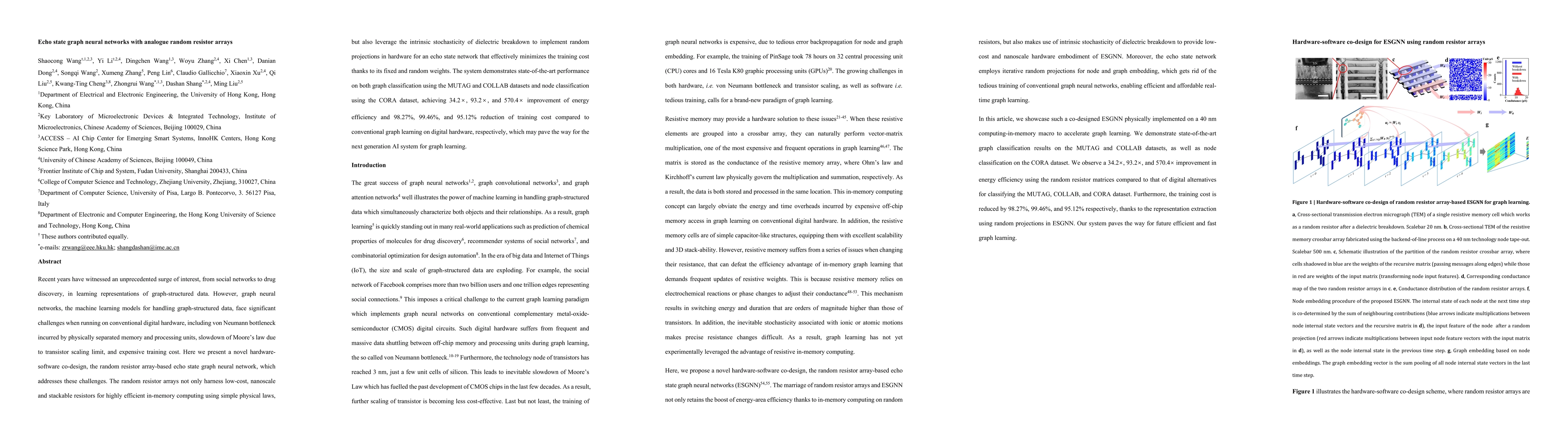 Recent years have witnessed an unprecedented surge of interest, from social networks to drug discovery, in learning representations of graph-structured data. However, graph neural networks, the machine learning models for handling graph-structured data, face significant challenges when running on conventional digital hardware, including von Neumann bottleneck incurred by physically separated memory and processing units, slowdown of Moore's law due to transistor scaling limit, and expensive training cost. Here we present a novel hardware-software co-design, the random resistor array-based echo state graph neural network, which addresses these challenges. The random resistor arrays not only harness low-cost, nanoscale and stackable resistors for highly efficient in-memory computing using simple physical laws, but also leverage the intrinsic stochasticity of dielectric breakdown to implement random projections in hardware for an echo state network that effectively minimizes the training cost thanks to its fixed and random weights. The system demonstrates state-of-the-art performance on both graph classification using the MUTAG and COLLAB datasets and node classification using the CORA dataset, achieving 34.2x, 93.2x, and 570.4x improvement of energy efficiency and 98.27%, 99.46%, and 95.12% reduction of training cost compared to conventional graph learning on digital hardware, respectively, which may pave the way for the next generation AI system for graph learning.