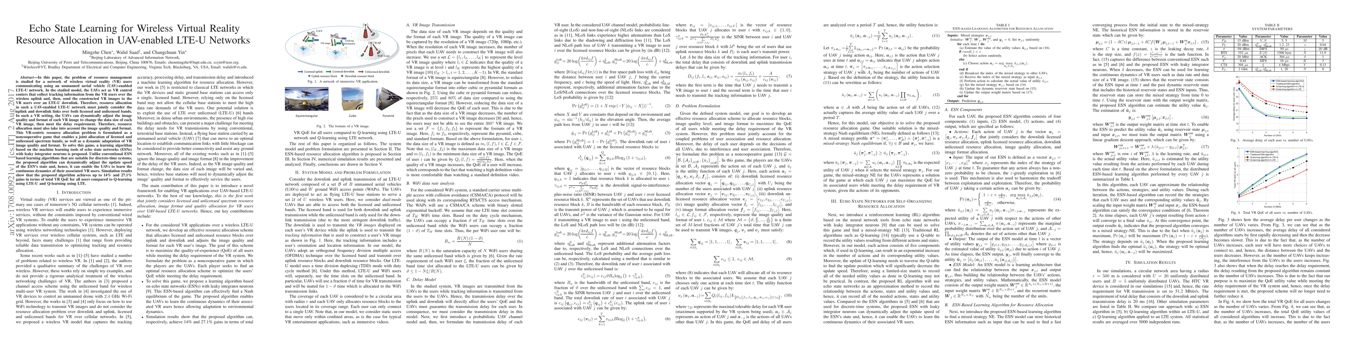This paper proposes an echo state learning algorithm for resource allocation in UAV-enabled LTE-U networks for wireless VR applications, addressing the dynamic adjustment of VR image quality and format to meet delay requirements. Simulation results show significant improvements in VR quality of experience (QoE) compared to Q-learning approaches.