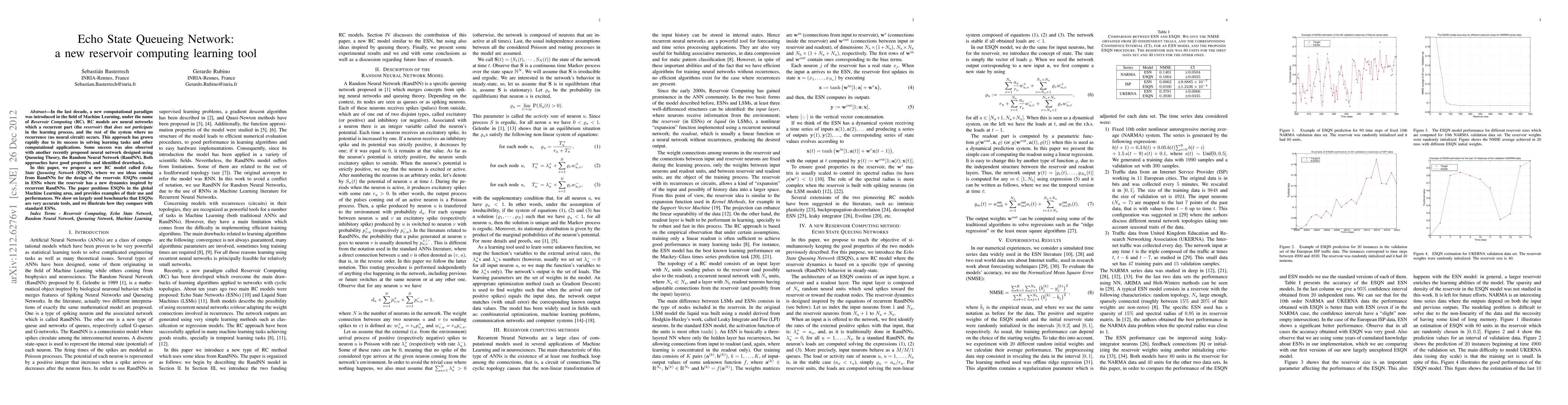 In the last decade, a new computational paradigm was introduced in the field of Machine Learning, under the name of Reservoir Computing (RC). RC models are neural networks which a recurrent part (the reservoir) that does not participate in the learning process, and the rest of the system where no recurrence (no neural circuit) occurs. This approach has grown rapidly due to its success in solving learning tasks and other computational applications. Some success was also observed with another recently proposed neural network designed using Queueing Theory, the Random Neural Network (RandNN). Both approaches have good properties and identified drawbacks. In this paper, we propose a new RC model called Echo State Queueing Network (ESQN), where we use ideas coming from RandNNs for the design of the reservoir. ESQNs consist in ESNs where the reservoir has a new dynamics inspired by recurrent RandNNs. The paper positions ESQNs in the global Machine Learning area, and provides examples of their use and performances. We show on largely used benchmarks that ESQNs are very accurate tools, and we illustrate how they compare with standard ESNs.