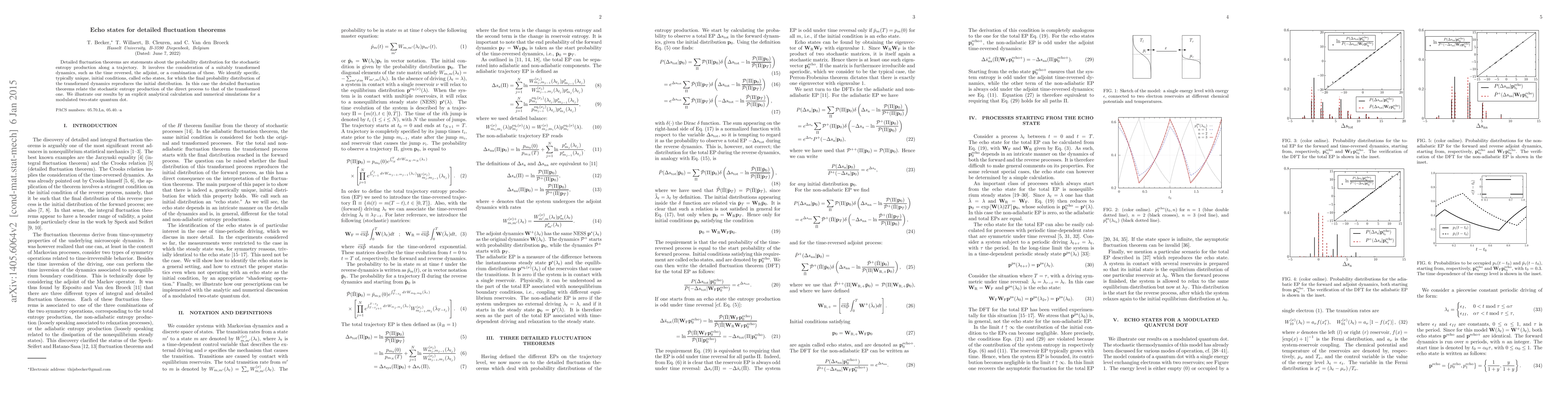 Detailed fluctuation theorems are statements about the probability distribution for the stochastic entropy production along a trajectory. It involves the consideration of a suitably transformed dynamics, such as the time reversed, the adjoint, or a combination of these. We identify specific, typically unique, initial conditions, called echo states, for which the final probability distribution of the transformed dynamics reproduces the initial distribution. In this case the detailed fluctuation theorems relate the stochastic entropy production of the direct process to that of the transformed one. We illustrate our results by an explicit analytical calculation and numerical simulations for a modulated two-state quantum dot.