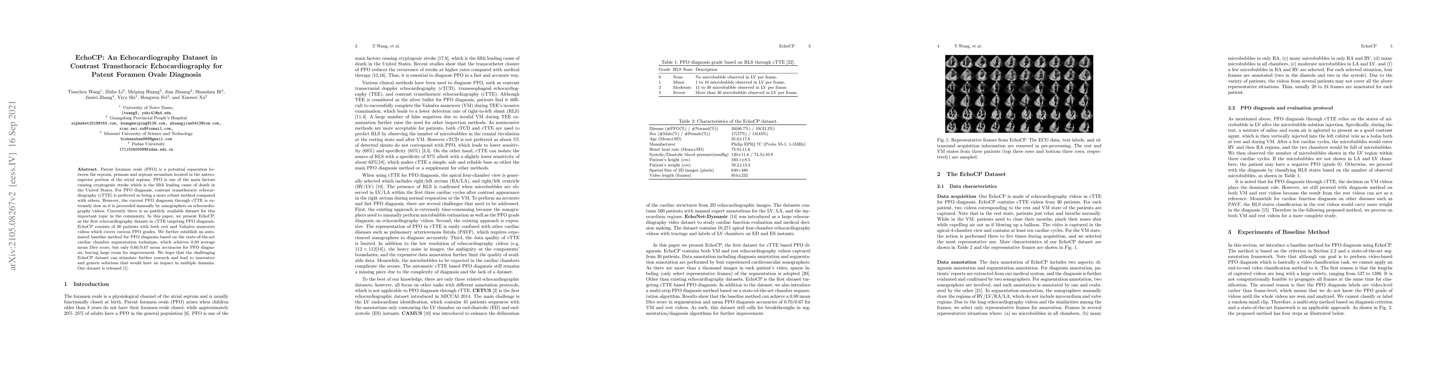 EchoCP introduces a new dataset for contrast transthoracic echocardiography (cTTE) aimed at diagnosing patent foramen ovale (PFO), a condition linked to cryptogenic stroke. The dataset includes 30 patients' videos, and an automated baseline method shows potential but requires further improvement.