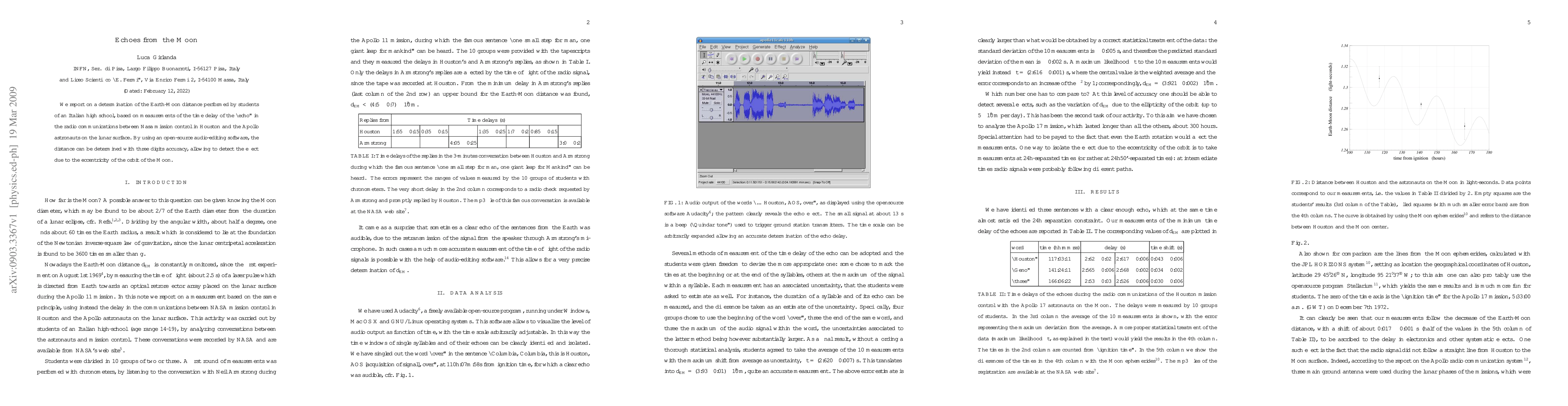 We report on a determination of the Earth-Moon distance performed by students of an Italian high school, based on measurements of the time delay of the "echo" in the radio communications between Nasa mission control in Houston and the Apollo astronauts on the lunar surface. By using an open-source audio-editing software, the distance can be determined with three digits accuracy, allowing to detect the effect due to the eccentricity of the orbit of the Moon.